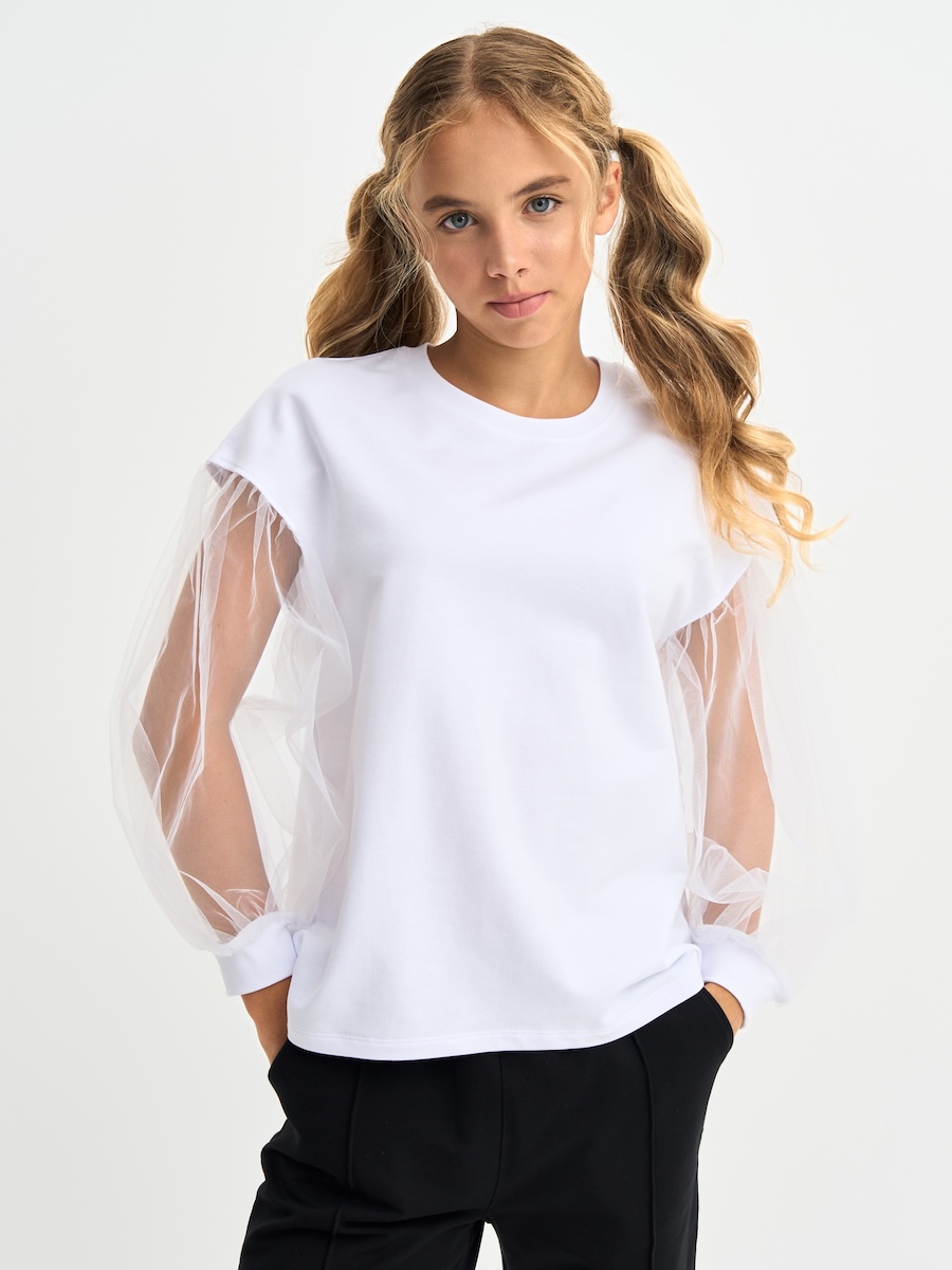 Кофта для девочки с пышными рукавами из фатина, линия плеча приспущена, спинка удлиненная. Джемпер выполнен из петлевого футера, 95% хлопок, 5% эластан.