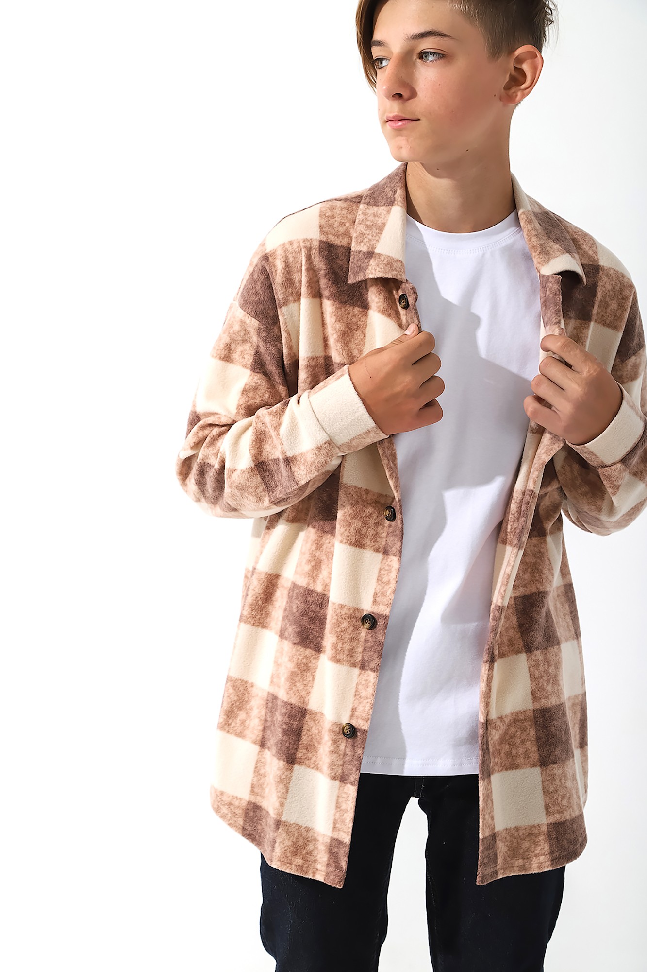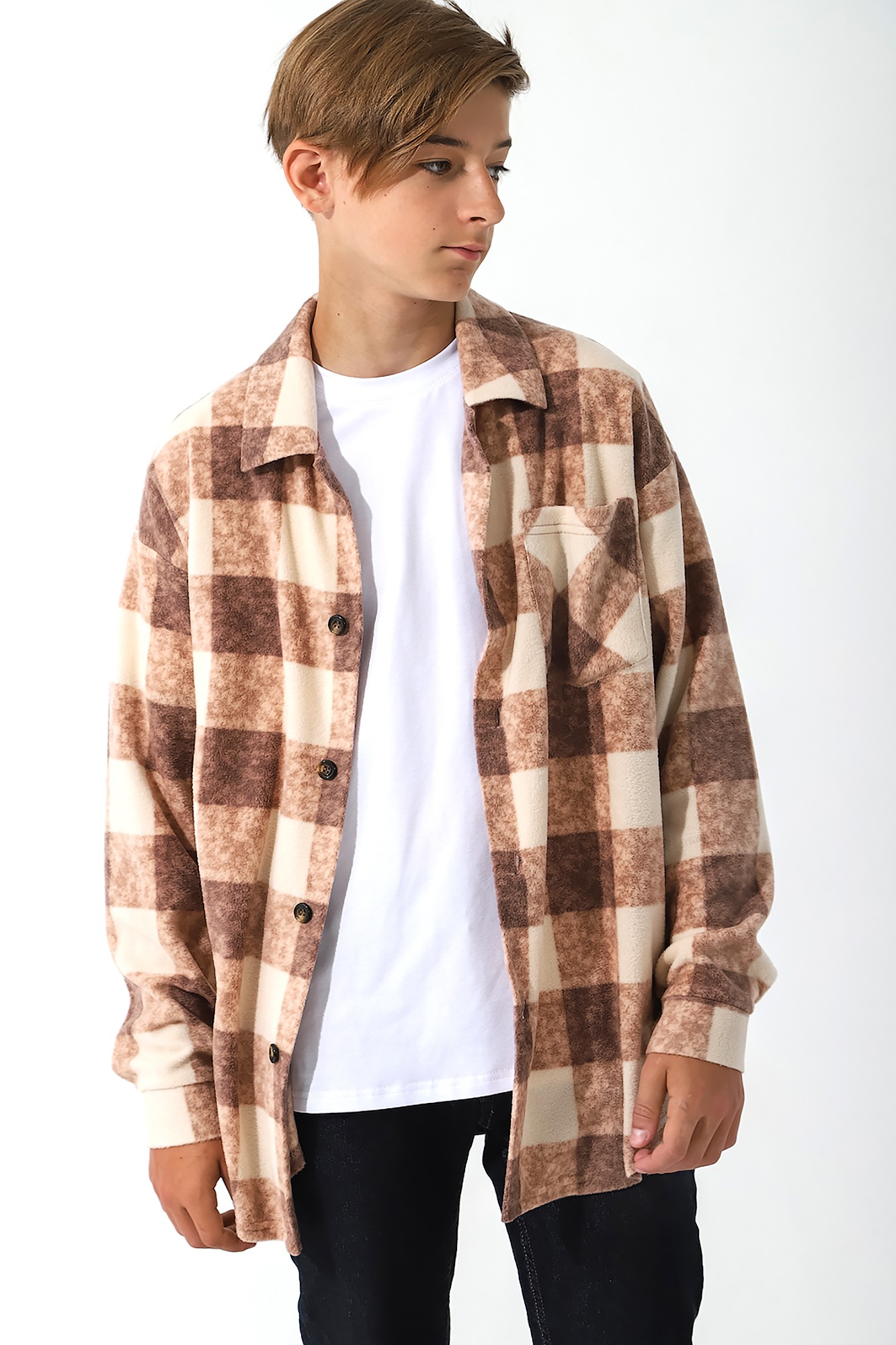 Актуальная рубашка для мальчика. Модель из клетчатого легкого флиса в объеме оверсайз, на пуговицах, с накладным карманом, фигурной линией низа.