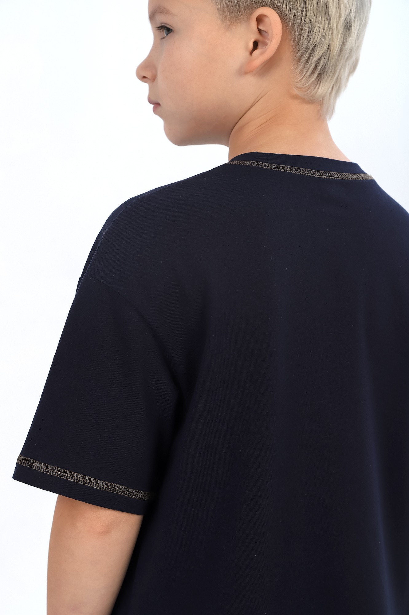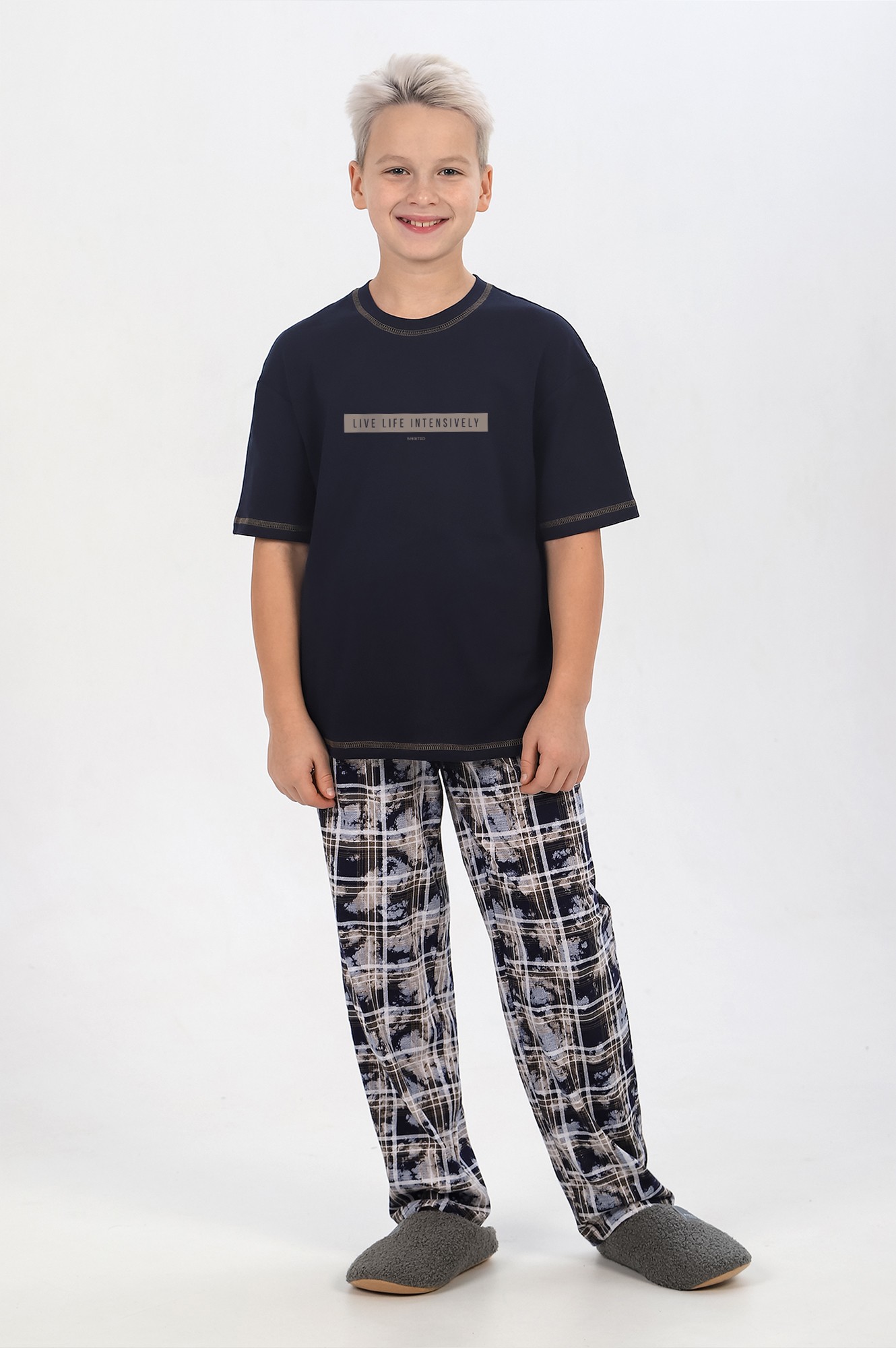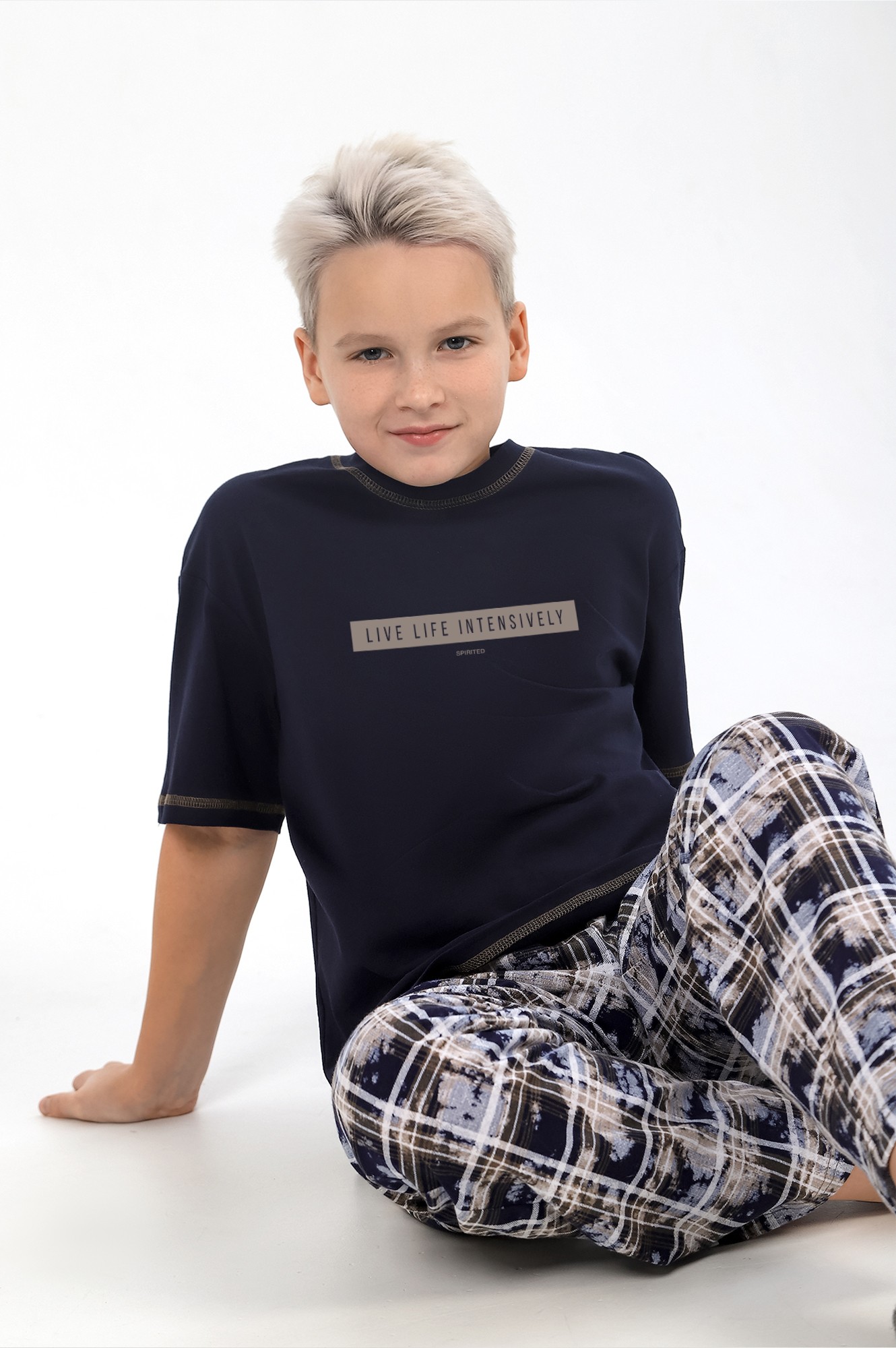 Костюм для мальчика, состоящий из футболки и брюк.Футболка - из гладкокрашеного полотна с принтом на детали переда, классического покроя, с короткими втачнвыми рукавами, удлиненными плечевыми швами и горловиной овальной формы, обработанной втачной планкой. По шву втачивания планки в горловину, подогнутому низу рукавов и подогнутому низу изделия настрочены декоративные отделочные строчки с застилом на лицевой стороне нитками контрастного цвета. Брюки - из полотна с набивным рисунком, длинные, на притачном поясе с эластичной тесьмой внутри и карманами в боковых швах с окантованными срезами Нижние срезы обработаны швом вподгибку.