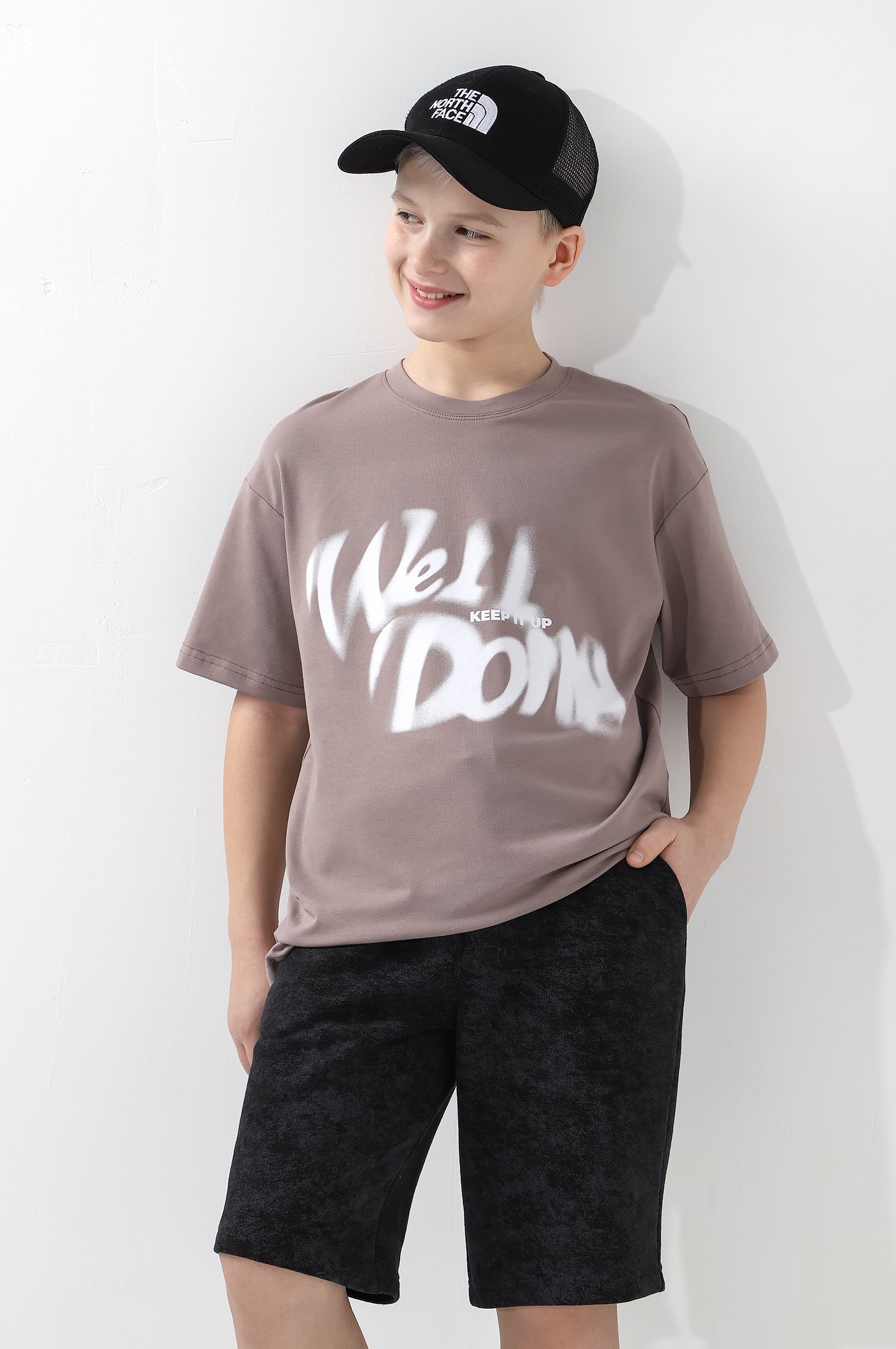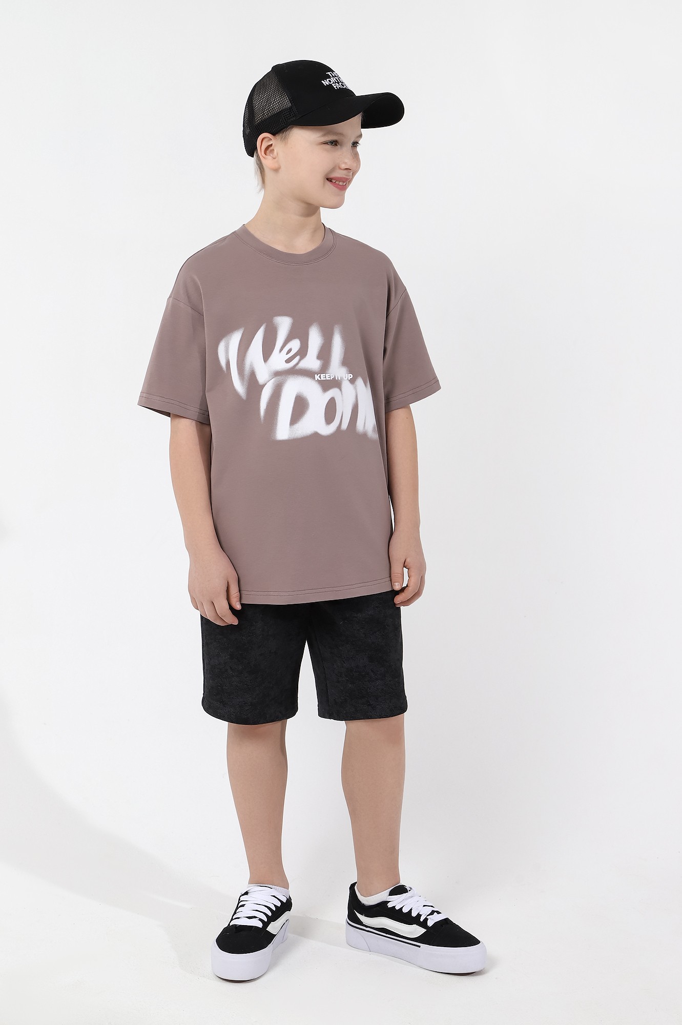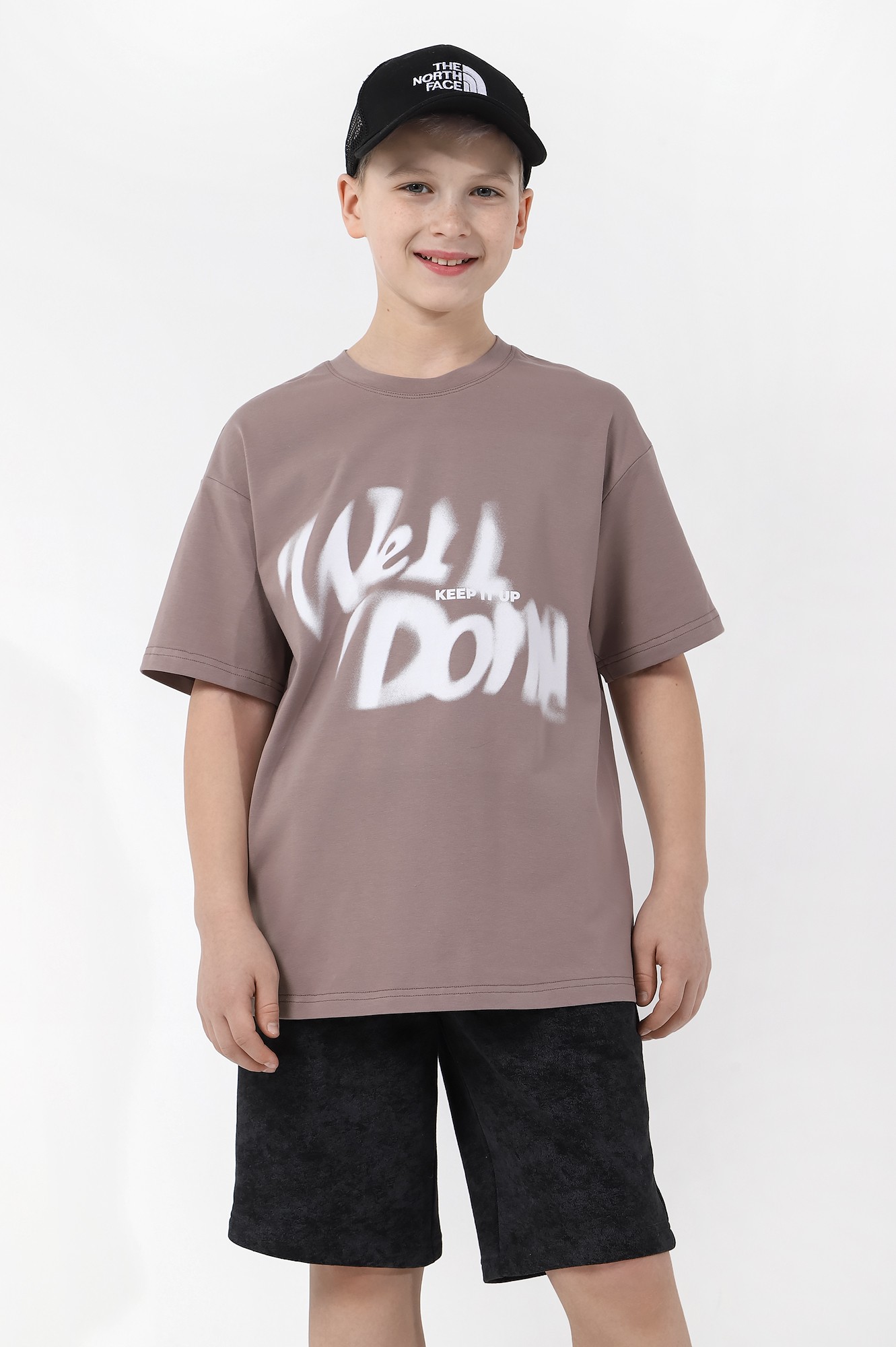 Футболка оверсайз для мальчика из трикотажного полотна: хлопкового с добавлением лайкры. Модель с принтом на переде, спущенной линией плеч, рукавами длиной до локтя.