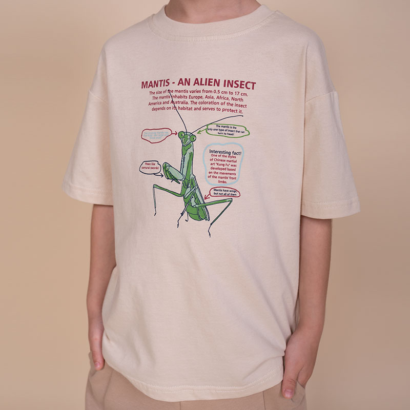 Состав: 100%хлопокОписание: Футболка детская – модель умеренного объема на каждый день, для дома и прогулок. Легкая трикотажная футболка подходит в качестве нательного белья и многослойных образов. Базовая футболка на любой сезон. Изделие сшито из 100% натурального хлопка, мягкий материал приятно прилегает к телу, не вызывая дискомфортных ощущений во время движений. Хлопок хорошо пропускает воздух, обеспечивает гигроскопичность, не задерживает влагу - ребенок не потеет. Детская футболка с небольшим вырезом горловины близко к шее. Горловина с широкой обтачкой из риба. Изделие прослужит долго и будет радовать износостойкостью. Модель представлена в бежевом цвете. Универсальный вариант на любой выход. Футболка для мальчика с принтом украшена изображением богомола и образовательным текстом, который переводится ""Богомол – инопланетное насекомое. Размер богомола варьируется от 0.5 см до 17 см. Богомол обитает в Евразии, Азии, Африке, Северной Америке и Австралии. Окраска насекомого зависит от его места обитания и служит для его защиты. Богомол – единственный вид насекомых, который может поворачивать голову. Интересный факт! Один из стилей китайского боевого искусства “Кунг Фу” был разработан на основе движений его передних лапок. У богомолов есть крылья, но не у всех. У богомола пять глаз: два больших и три дымчатых. Лапы как самурайские мечи"". Прикольная, детская футболка для мальчика подростка с принтом привлекает интересным дизайном. Футболка для мальчика подростковая рассчитана на возраст садика и школы. Размерная линейка: 1 (86): 2 (92): 3 (98): 4 (104): 5 (110): 6 (116): 7 (122): 8 (128): 9 (134): 10 (140): 11 (146). Крутая футболка для мальчика – отличный подарок для сына, внука, братика, племянника, крестника!Выбирайте нужный размер по таблице размеров на фото.Цвет товара на экране вашего устройства может отличаться от цвета изделия вживую.