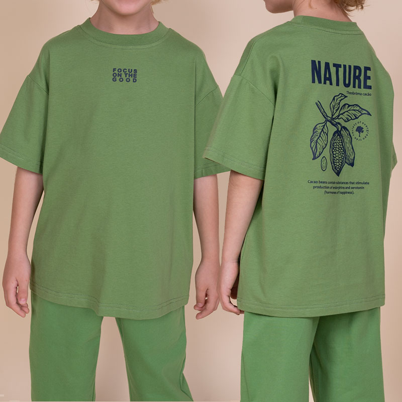 Состав: 100%хлопокОписание: Футболка для мальчика оверсайз – модель большого объема на каждый день, для дома и прогулок. Легкая трикотажная футболка подходит в качестве нательного белья и многослойных образов. Базовая футболка на любой сезон.Изделие сшито из 100% натурального хлопка. Футболка детская для мальчика из мягкого материала приятно прилегает к телу, не вызывая дискомфортных ощущений во время движений. Хлопок хорошо пропускает воздух, обеспечивает гигроскопичность. Материал не задерживает влагу - ребенок не потеет. Футболка для мальчика оверсайз с оптимальным размером горловины удобна в носке - позволит ребенку с легкостью надевать и снимать ее самостоятельно. Футболка для мальчика прослужит долго и будет радовать износостойкостью. Модель представлена в цвете хаки. Красивыйзеный цвет - интересный вариант на любой выход. Футболка для мальчика с принтом украшена изображением ветки шоколадного дерева и образовательным текстом: "Nature. Theobroma cacao. Variety of ever green tree. Cacao beans contain substances that stimulate production of endorphins and serotonin (harmones of happiness)" – перевод "Природа. Шоколадное дерево. Сорт вечнозеленого дерева. Какао бобы содержат вещества, стимулирующие выработку эндерфинов и серотонина". На спинке – принт с надписью "Focus on the good" – перевод "Фокусируйся на хорошем". Изделие привлекает стильным дизайном. Свободная футболка для мальчика подростковая рассчитана на возраст садика и школы. Размерная линейка: 1 (86): 2 (92): 3 (98): 4 (104): 5 (110): 6 (116): 7 (122): 8 (128): 9 (134): 10 (140): 11 (146). Крутая футболка для мальчика – отличный подарок для сына, внука, братика, племянника, крестника!Выбирайте нужный размер по таблице размеров на фото.Цвет товара на экране вашего устройства может отличаться от цвета изделия вживую.