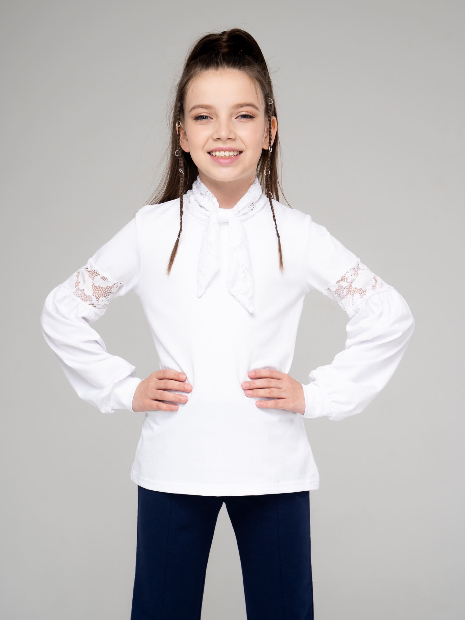 Стильная трикотажная блуза из кулирки белого цвета для девочкис длинными рукавами,на рукавах выше уровня логтя кружевная вставка, по низу рукава сборка и манжеты,сзади по спинке потайная молния. Изделие выполнено из трикотажа премиального качества - ПЕНЬЕ, с содержанием хлопка более 95%