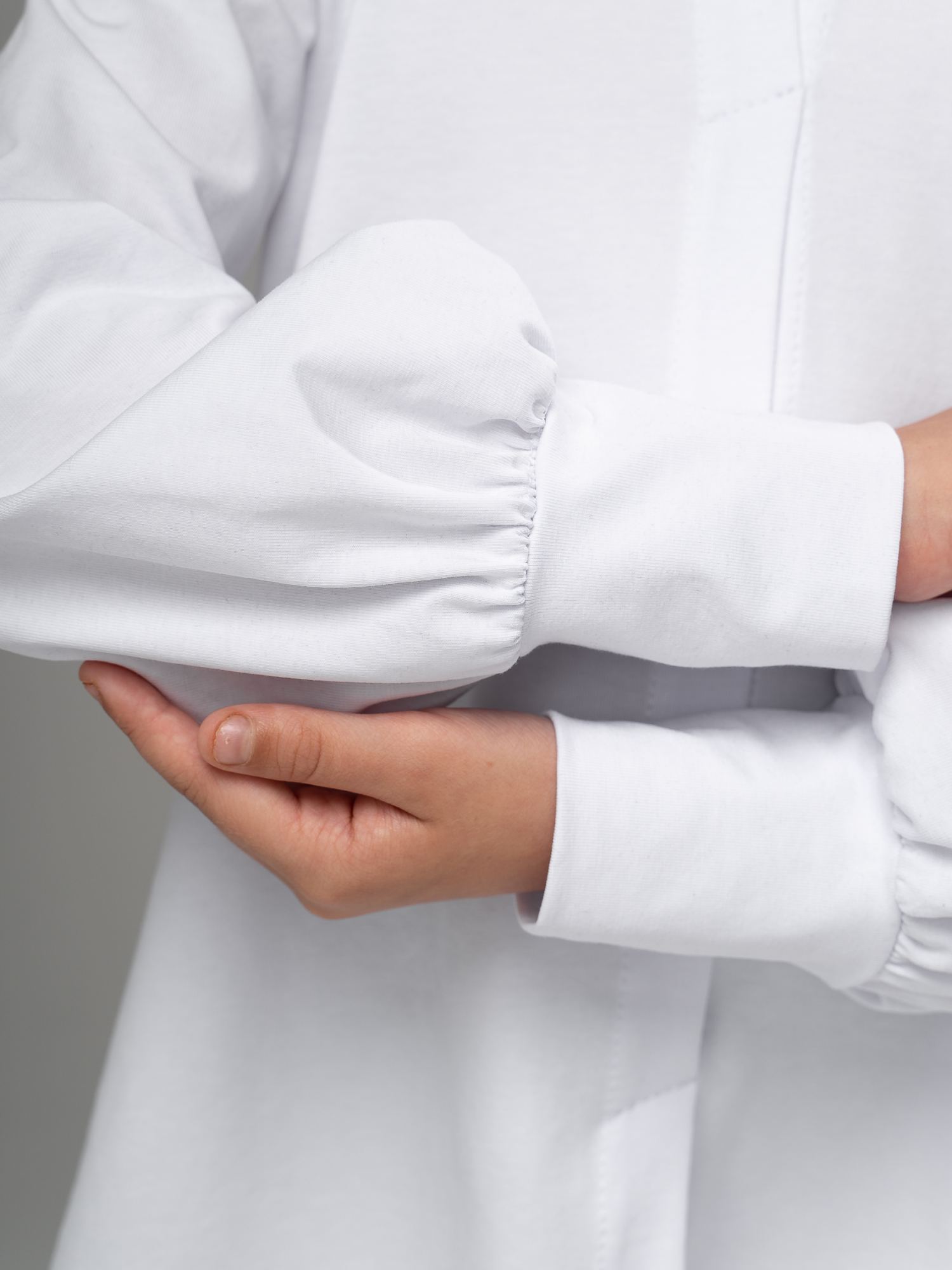 Стильная блуза-рубашка из кулирки белого цвета для девочки свободного силуэта с длинными рукавами и отложным воротником. Спинка с двойной кокеткой. Низ рукава на манжетах с изящной сборкой. Изделие выполнено из трикотажа премиального качества - ПЕНЬЕ, с содержанием хлопка более 95%