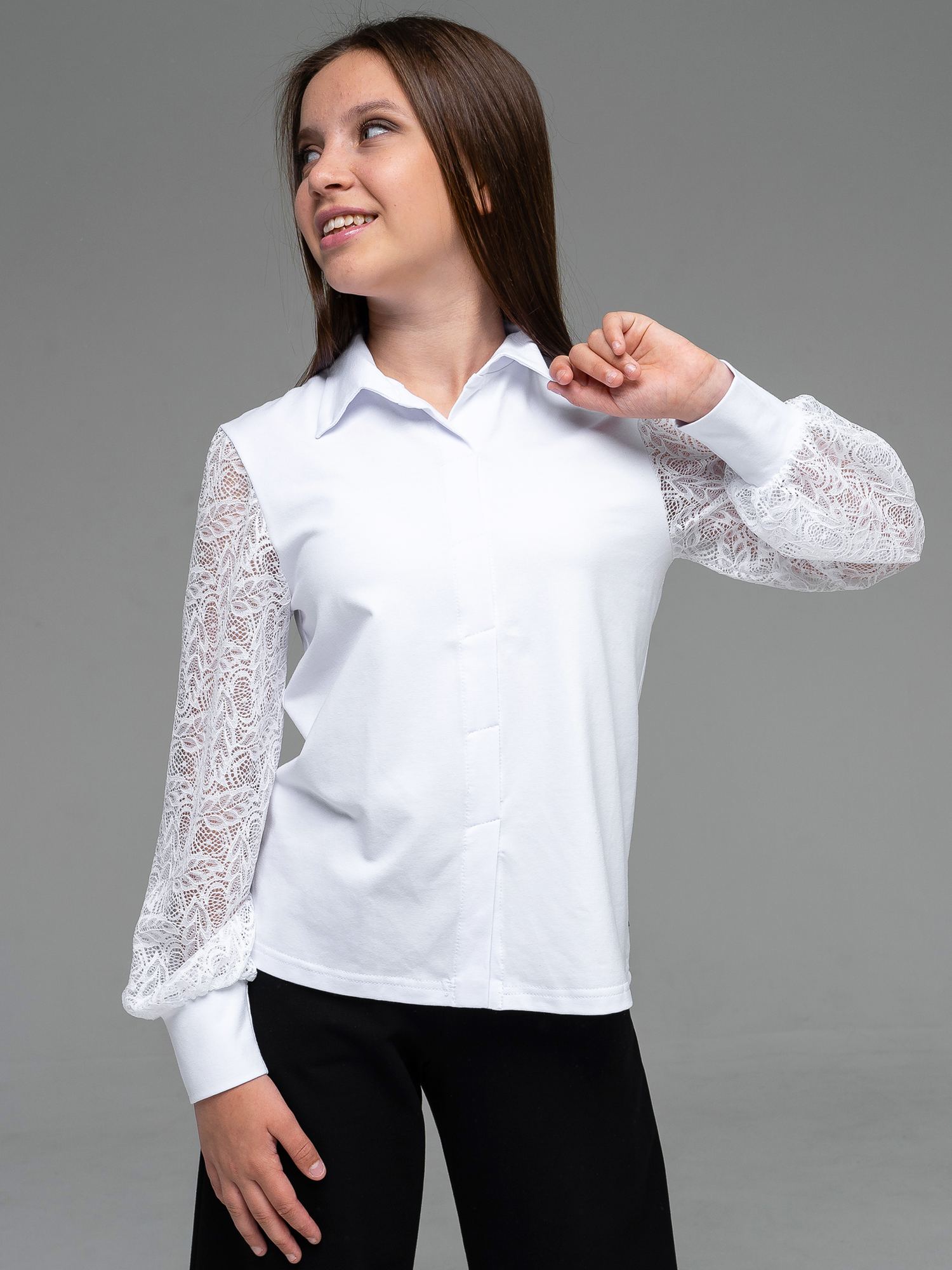 Элегантная рубашка из кулирки белого цвета для девочки свободного силуэта с длинными рукавами из кружевного полотна, с отложным воротником. Спинка с двойной кокеткой. Низ рукава на манжетах со изящной сборкой. Изделие выполнено из трикотажа премиального качества - ПЕНЬЕ, с содержанием хлопка более 95%
