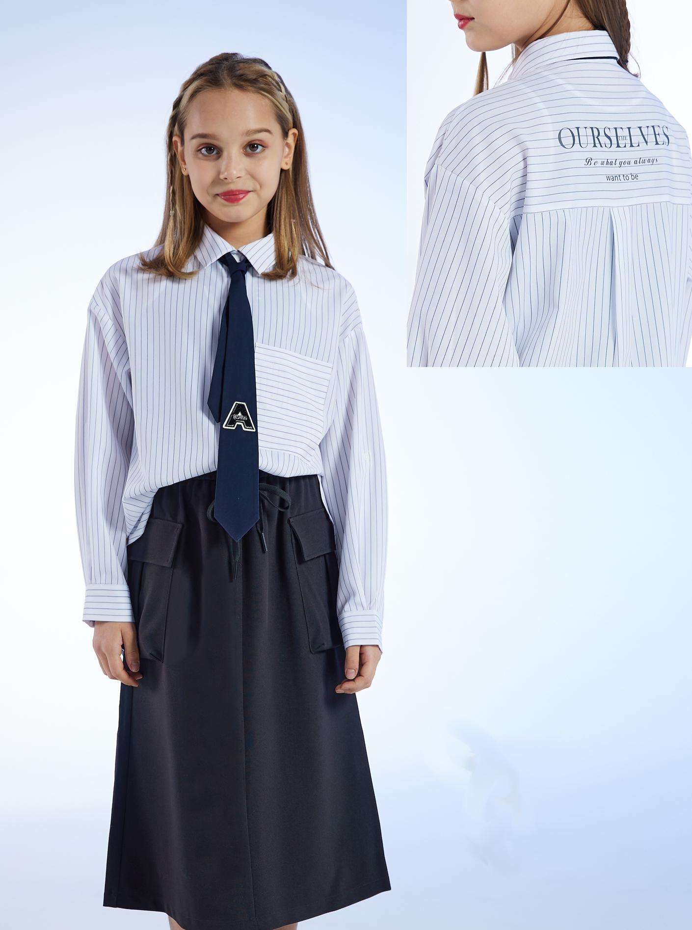 Блузка для девочки с длинным рукавом из премиальной вискозной ткани свободного кроя. Отложной воротник. Застежка на кнопки. Спинка немного длиннее. Спущенное плечо. Накладной карман. Рукав можно подвернуть. По спинке надпись. Галстук в комплект не входит.