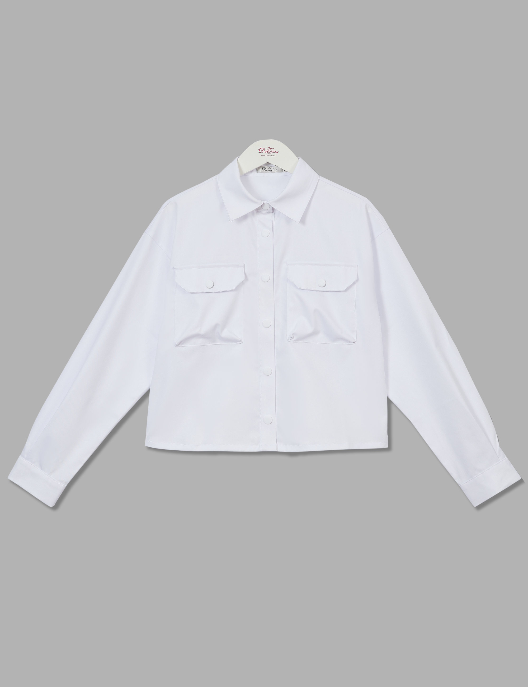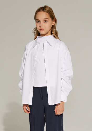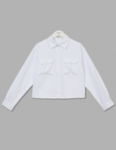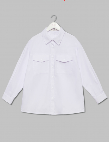 Блузка для девочки с длинным рукавом из премиальной вискозной ткани свободного кроя. Отложной воротник. Застежка на кнопки. Спущенное плечо.  Накладные карманы