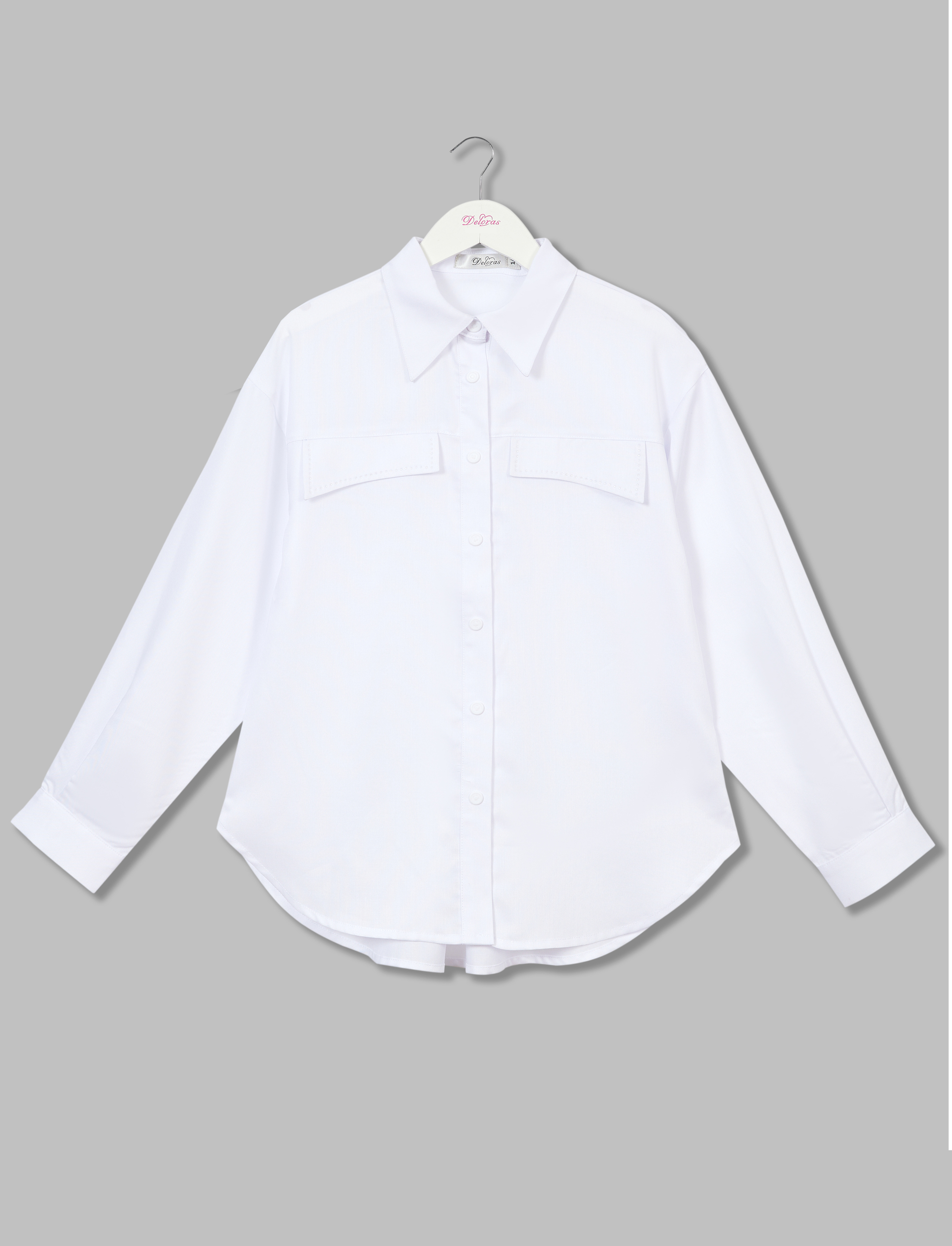 Блузка для девочки с длинным рукавом из вискозной ткани свободного кроя. Отложной воротник. Застежка на кнопки. Спущенное плечо.