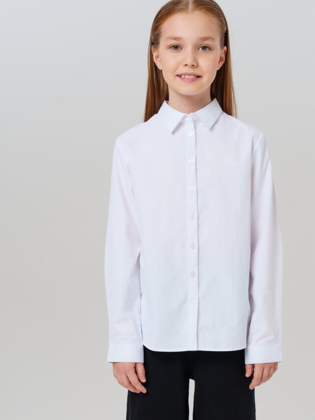 Классический прямой силуэт с аккуратным воротником и застёжкой на пуговицах делает блузку универсальной: она одинаково хорошо смотрится с юбкой, сарафаном или брюками. Посадка comfort не сковывает движений — ребёнку удобно на уроках, переменах и прогулках.