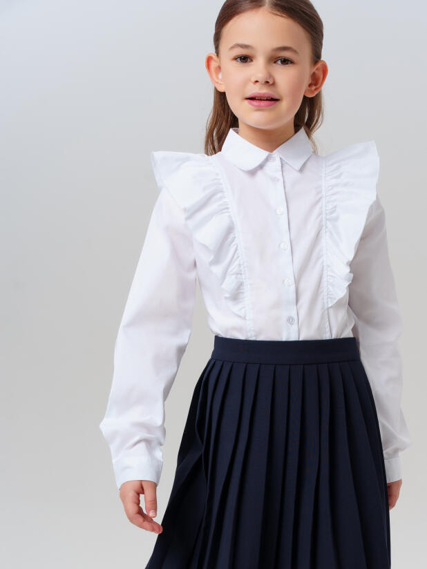 Совет по стилю: белая блузка с воланами отлично сочетается с классической школьной формой от PlayToday — юбками, сарафанами, брюками или жилетами. Для праздничного образа добавьте банты, галстук или брошь.