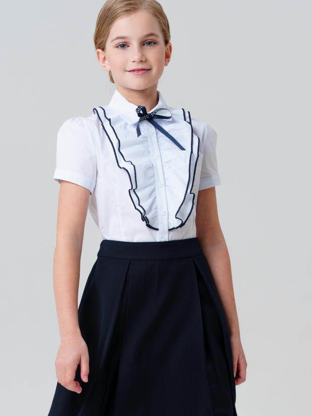 Продуманный полуприлегающий крой с лёгким акцентом на талию подчёркивает силуэт, но не сковывает движений. А короткие рукава и воротник с рюшами добавляют образу лёгкости и особого настроения — такая деталь точно не останется незамеченной. Застёжка на пуговицах спереди — практичное и удобное решение для школы.