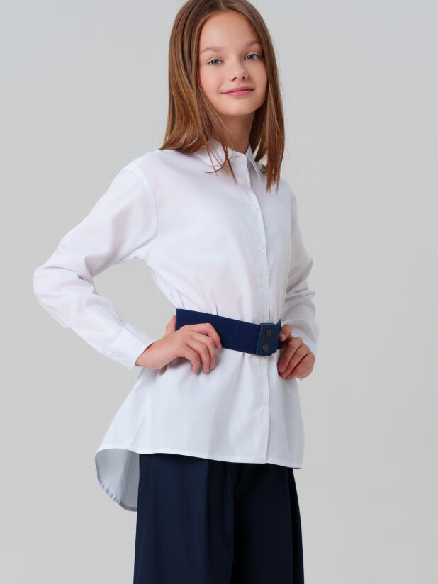 Удлинённая спинка придаёт современный силуэт и делает посадку особенно комфортной — можно свободно двигаться, наклоняться, поднимать руки, не переживая, что одежда задёрнется. Классический воротничок и аккуратные пуговицы подчёркивают школьный стиль, а пояс позволяет менять образ — носить блузку свободно или подчеркнуть талию.
