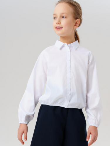 Эта белая блузка для девочки-подростка выполнена из плотного хлопкового полотна с добавлением эластана — ткань приятная на ощупь, дышит и отлично держит форму. Она не вытягивается, не теряет цвет и остаётся опрятной даже после многочисленных стирок. Такая хлопковая блузка станет идеальной основой школьного гардероба.