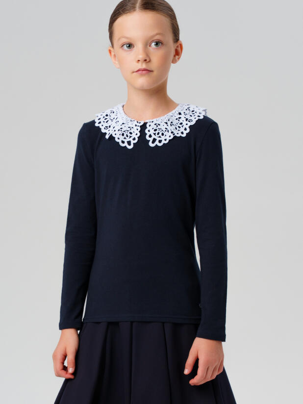 Кружевной воротник придаёт образу утончённость и нарядный акцент, сохраняя при этом универсальность. Прямой крой с аккуратной посадкой создаёт комфорт и свободу движений — ребёнку будет удобно как на уроках, так и на переменах. Блузка с длинным рукавом на пуговице сзади — практично и удобно для самостоятельного переодевания.
