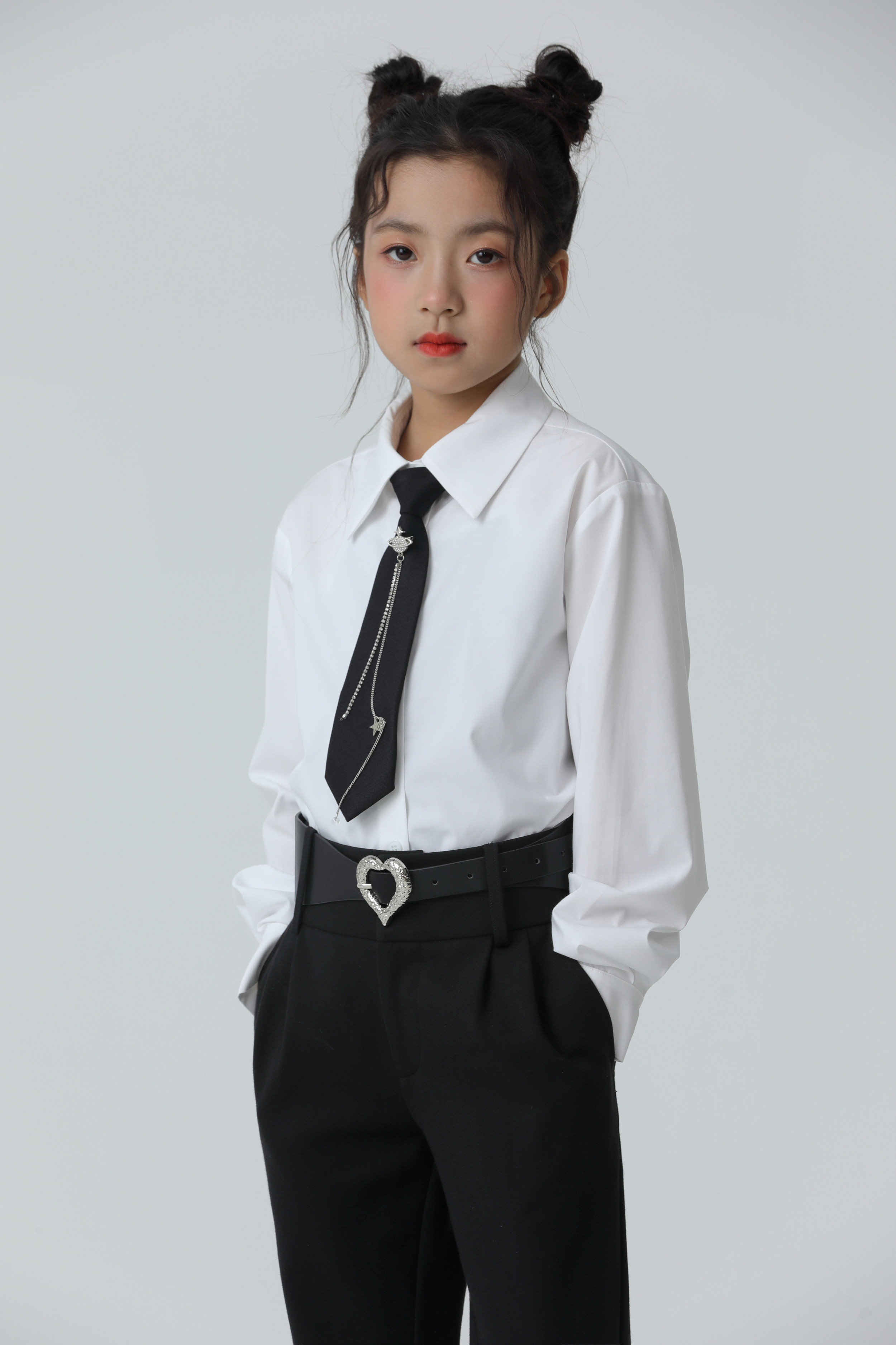 Блузка с длинным рукавом из  премиальной вискозной ткани свободного кроя. Спущенное плечо. Застежка на пуговицы. Галстук черного цвета с металлической брошью на резинке в комплекте.