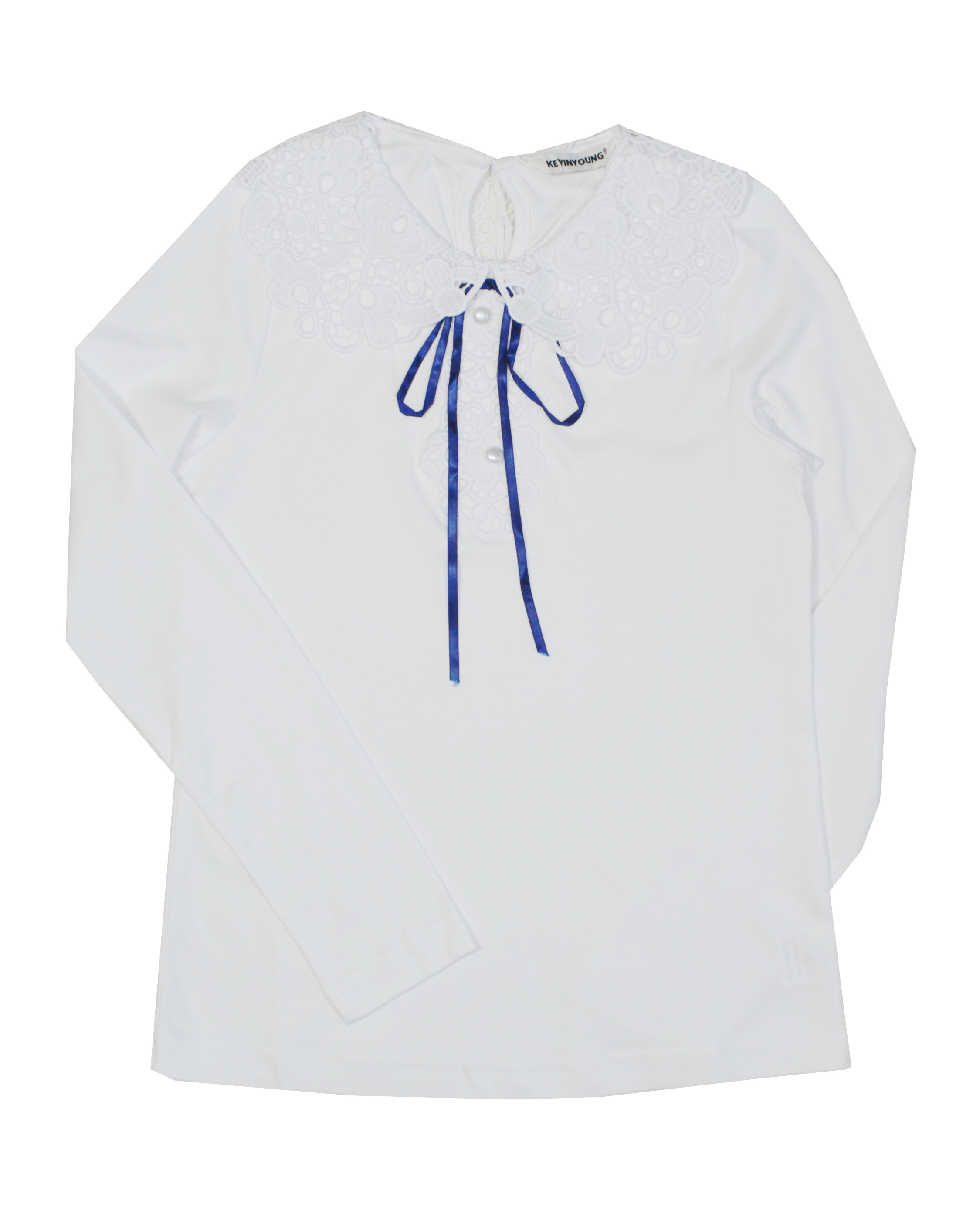 Блузка с длинным рукавом из  трикотажной ткани. Застежка капелька на пуговицу по спинке. Воротник из плотного кружева. Дополнена лентой синего цвета.