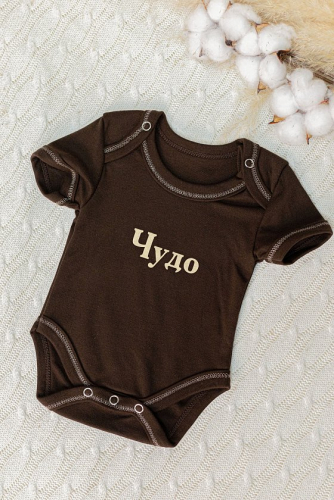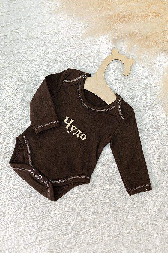 Боди для новорожденных из интерлока в коричневом цвете. Длинные рукава подойдут для теплоты и защиты в прохладные дни. За счет застежек-кнопок в нижней части и на пересечении горловины, переодевание малыша будет удобным. Бейка в цвет основного полотна на горловине, рукавах и по низу придает изделию завершенный вид. Спереди нанесен принт, который добавит изюминку и индивидуальность образу.