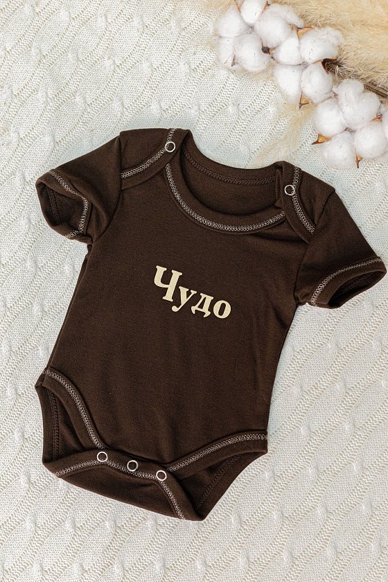 Боди для новорожденных с коротким рукавом из интерлока в коричневом цвете. За счет застежек-кнопок в нижней части и на пересечении горловины, переодевание малыша будет удобным. Бейка в цвет основного полотна на горловине, рукавах и по низу придает изделию завершенный вид. Спереди нанесен принт, который добавит изюминку и индивидуальность образу.