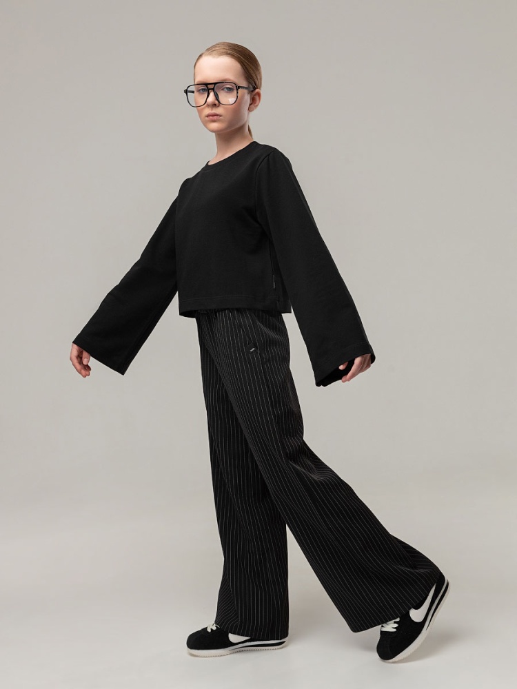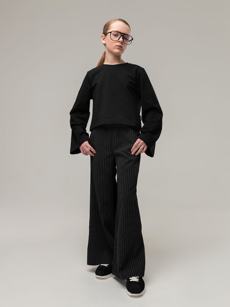 Материал плательно-костюмная ткань Состав 100% полиэстер Свободные брюки-трубы из костюмной ткани. Брюки в полоску, с боковыми карманами.