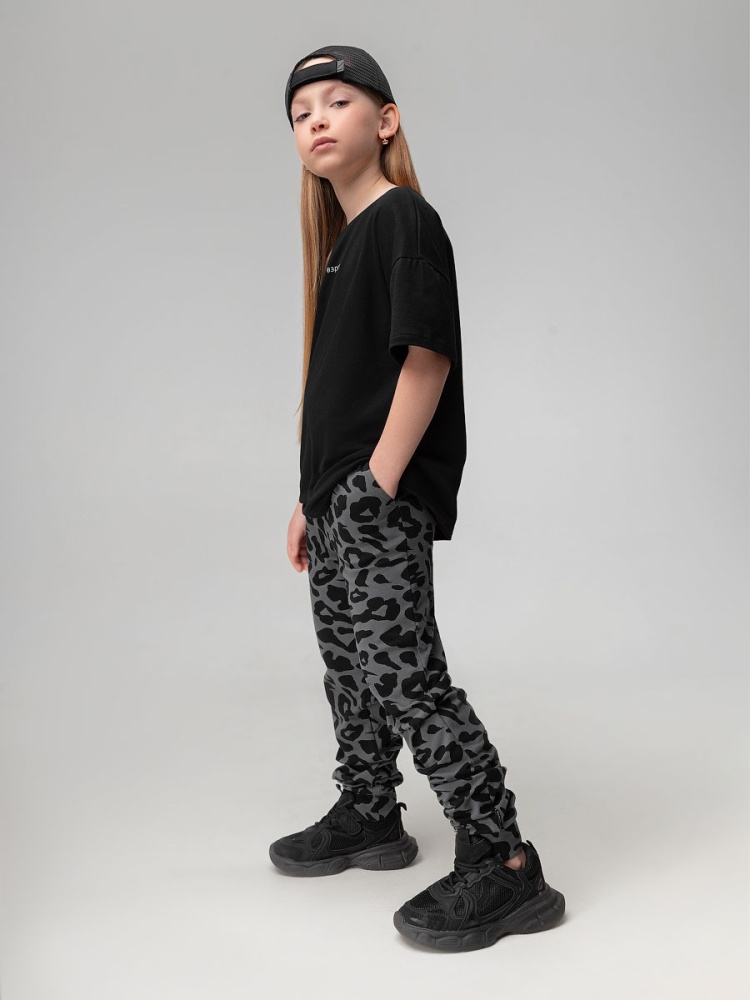 Материал кулирная гладь Состав 92% хлопок 8% лайкра Брюки- джоггеры детские. Детали: полуприлегающий покрой, пояс - эластичная резинка, низ изделия- манжеты.