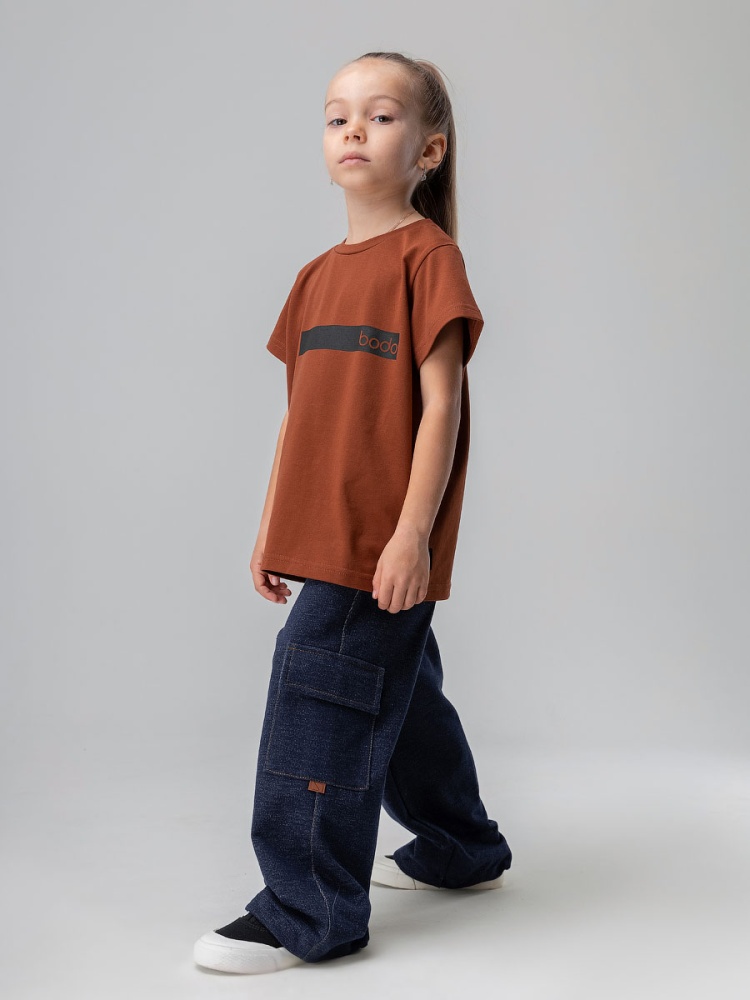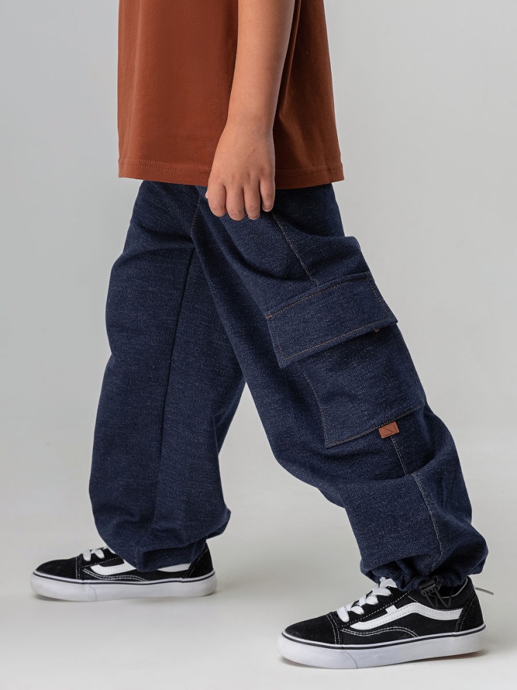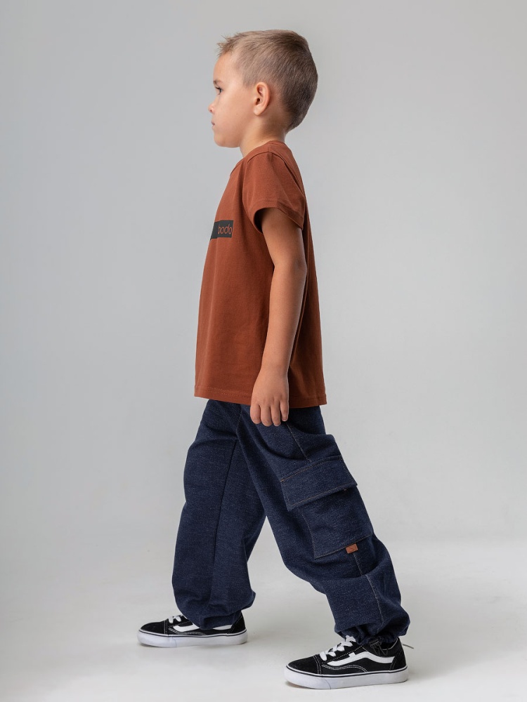 Материал футер двухнитка Состав 100% хлопок Брюки карго детские. Брюки с накладными карманами на разном уровне, без карманов с отрезным бочком, низ на подрубке с резинкой и стопором. По низу брюк расположена резинка-утяжка, которая позволяет регулировать ширину штанин. Для безопасности петельку из резинки нужно закрепить с помощью кнопки, расположенной с внутренней стороны. Состав: футер двухнитка 100% хлопок
