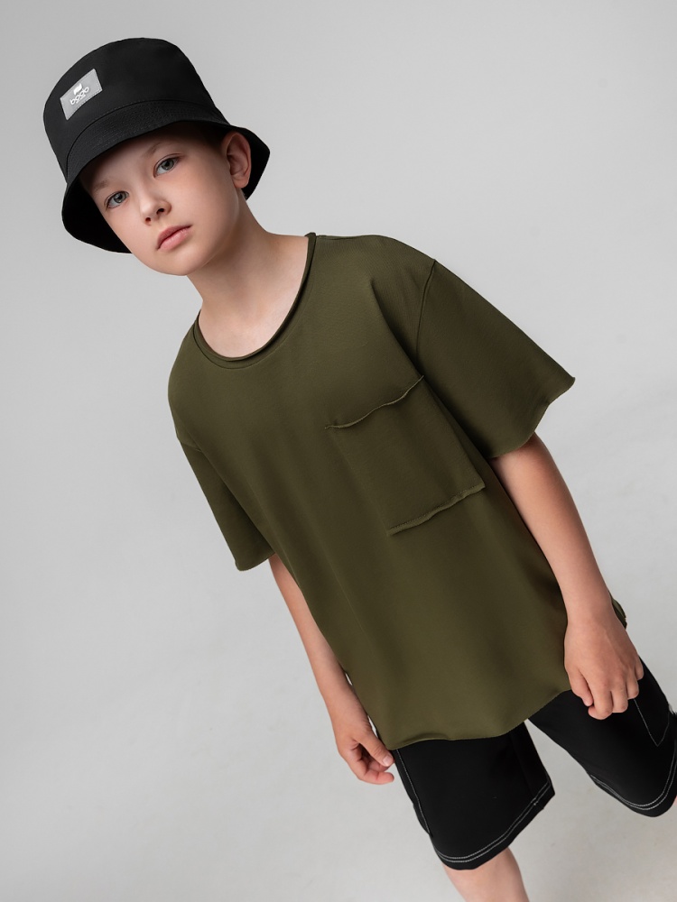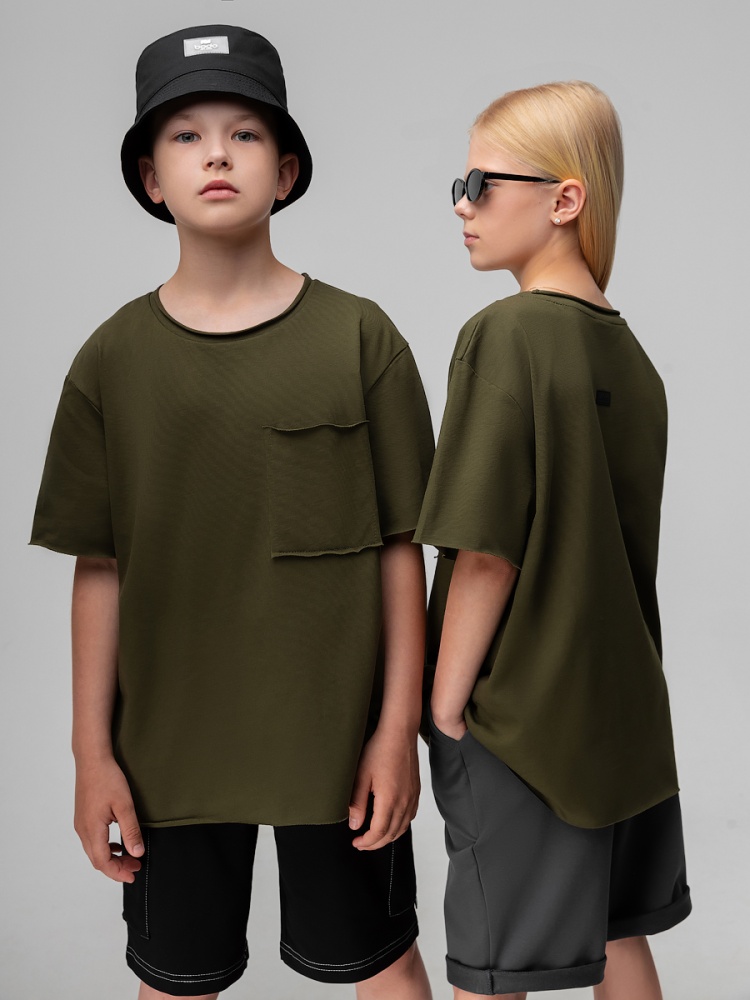 Материал кулирная гладь Состав 100% хлопок Футболка для детей школьного возраста. Футболка свободного силуэта, с коротким рукавом, горловина округлой формы, на полочке располагается карман. Футболка с необработанными краями.