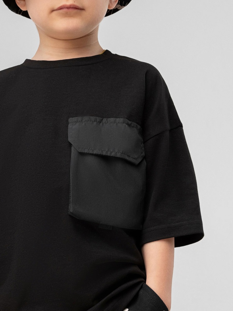 Материал кулирная гладь Состав 92% хлопок 8% лайкра Свободная футболка со спущенным плечом, короткий рукав. На полочке расположен накладной карман с клапаном из дюспы.