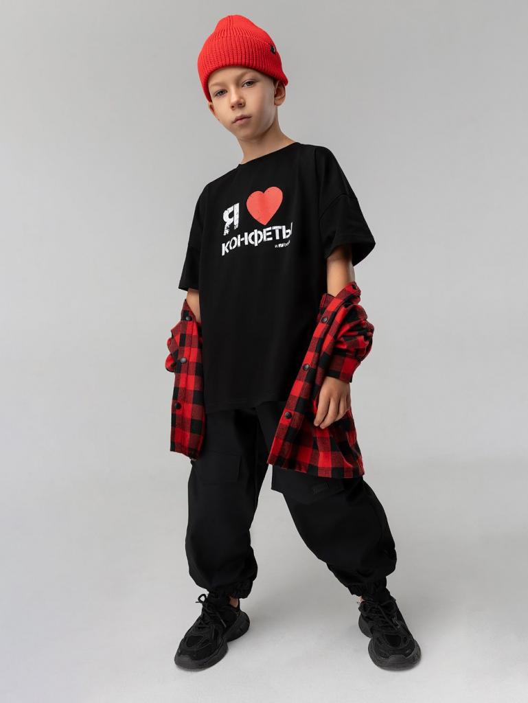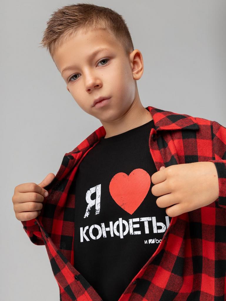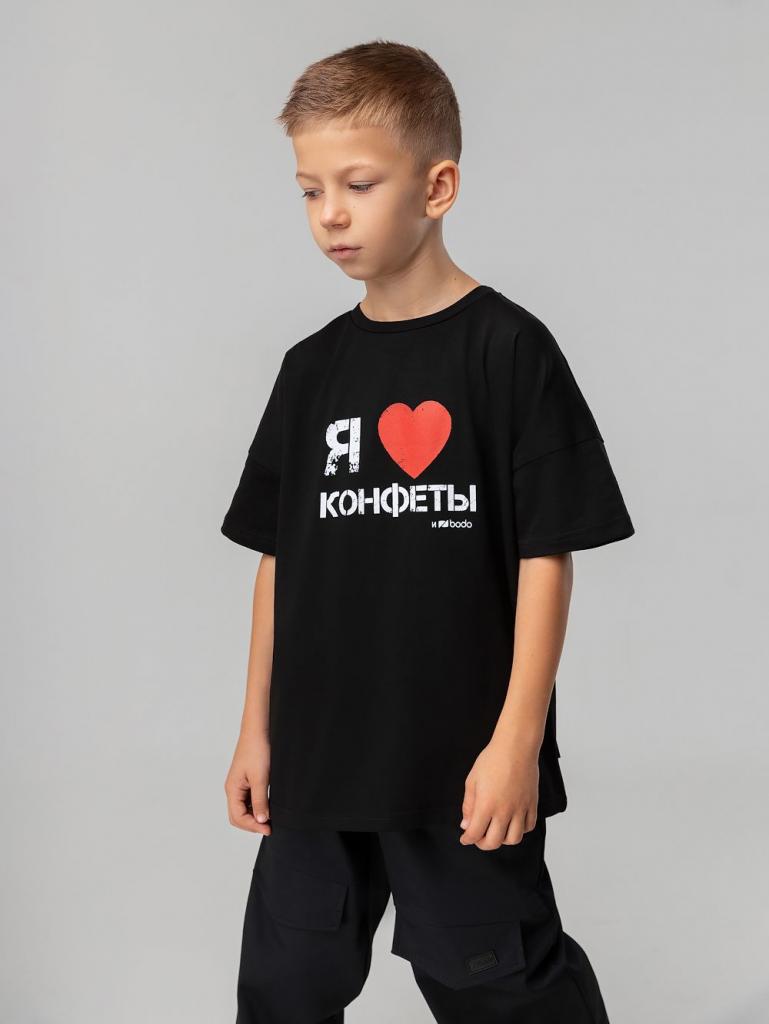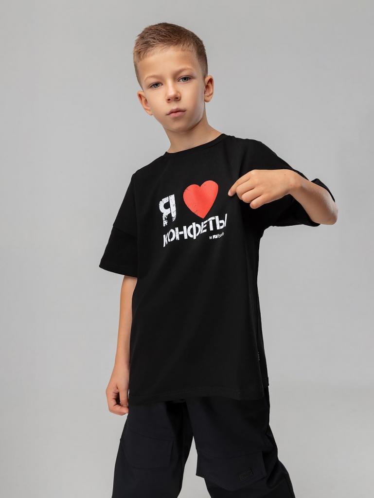 Артикул 4-475MU Материал кулирная гладь Состав 92% хлопок 8% лайкра Свободная футболка с коротким рукавом. Горловина футболки округлой формы. Низ изделия прямой. Принт на полочке " Я люблю конфеты"