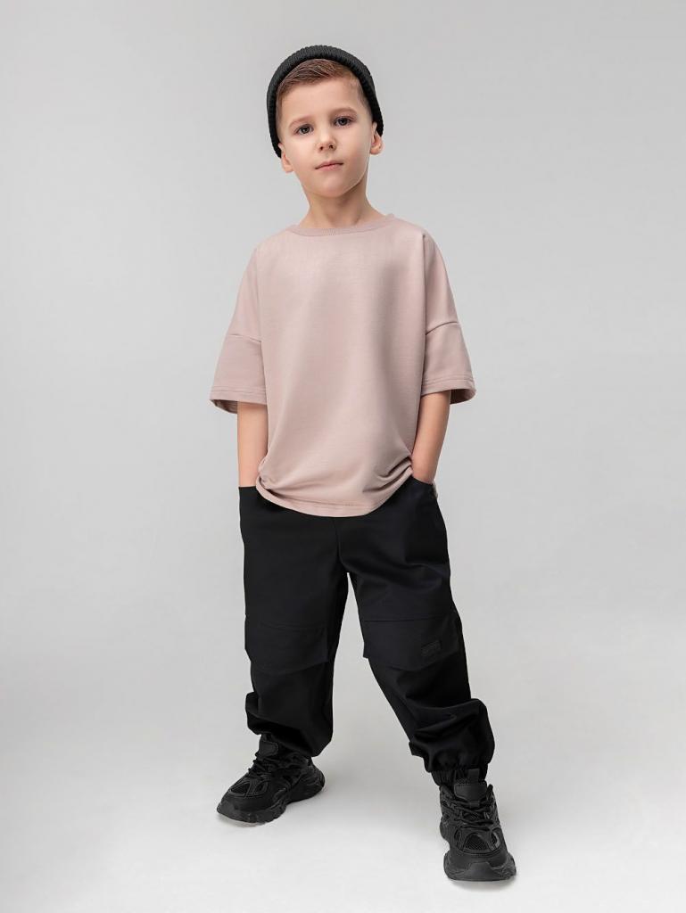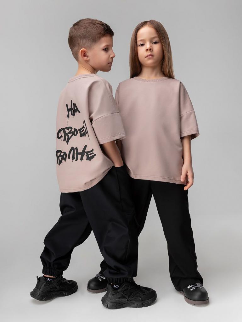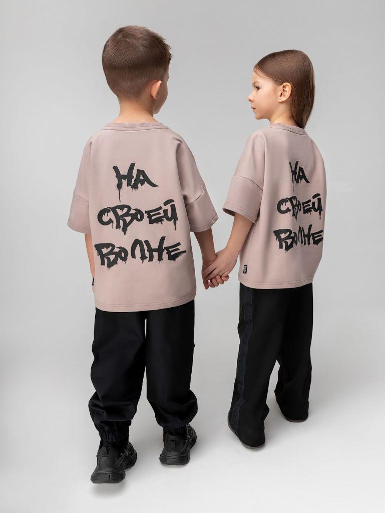 Артикул 4-348MU Состав 92% хлопок 8% лайкра Материал футер двухнитка Детская футболка. Детали: короткие рукава, свободный покрой, округлый вырез горловины. Принт на спинке "На своей волне"