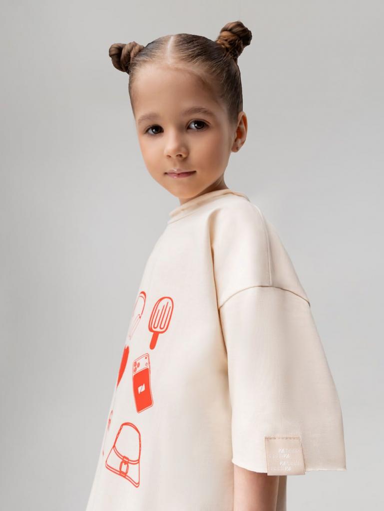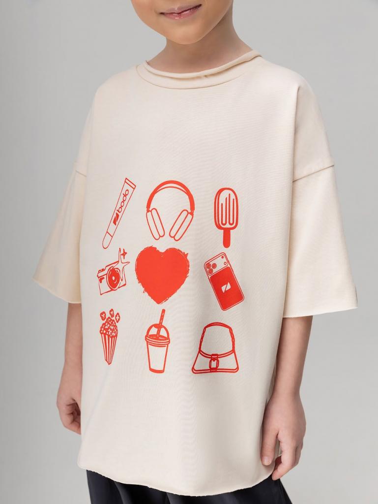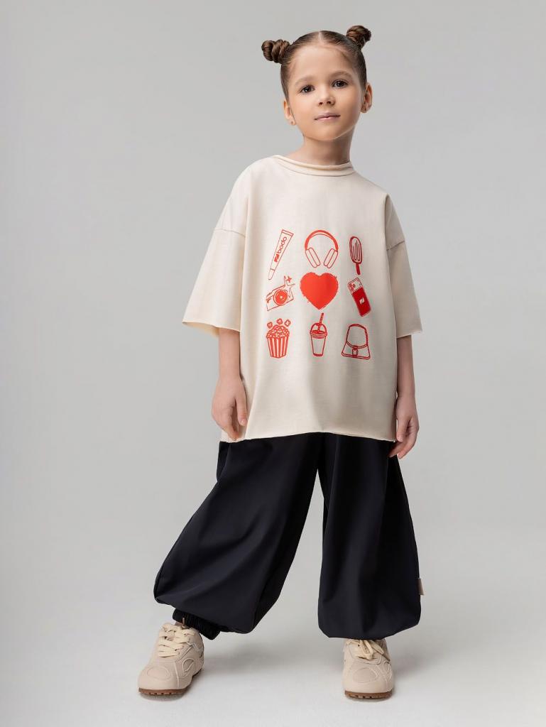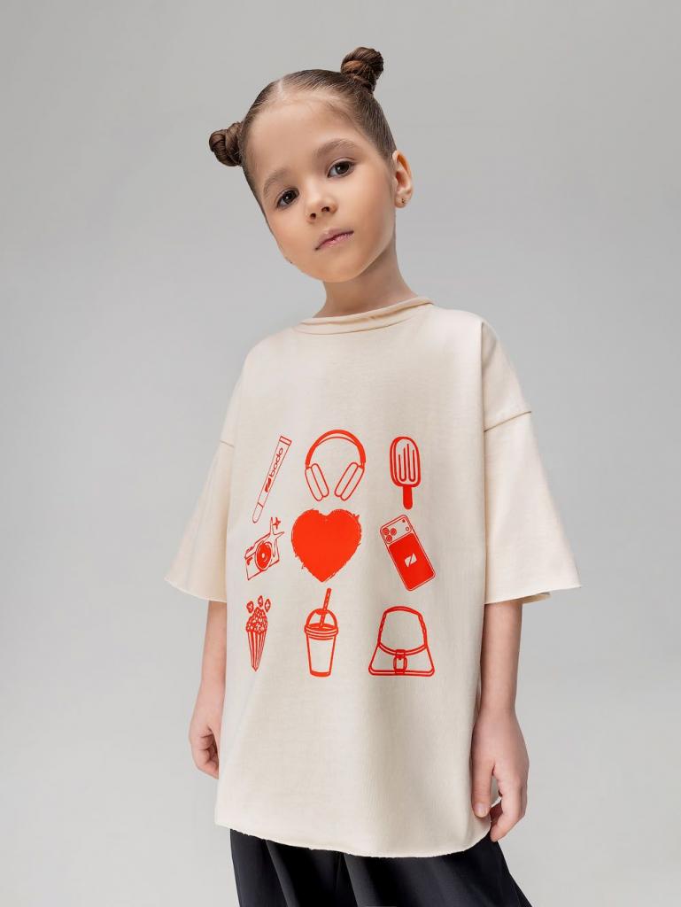 Артикул 4-485MU Состав 100% хлопок Материал кулирная гладь Свободная футболка с коротким рукавом. Горловина футболки округлой формы с необработанным краем. Низ изделия и низ рукава не обработаны. На полочке принт