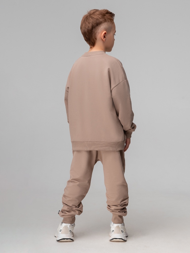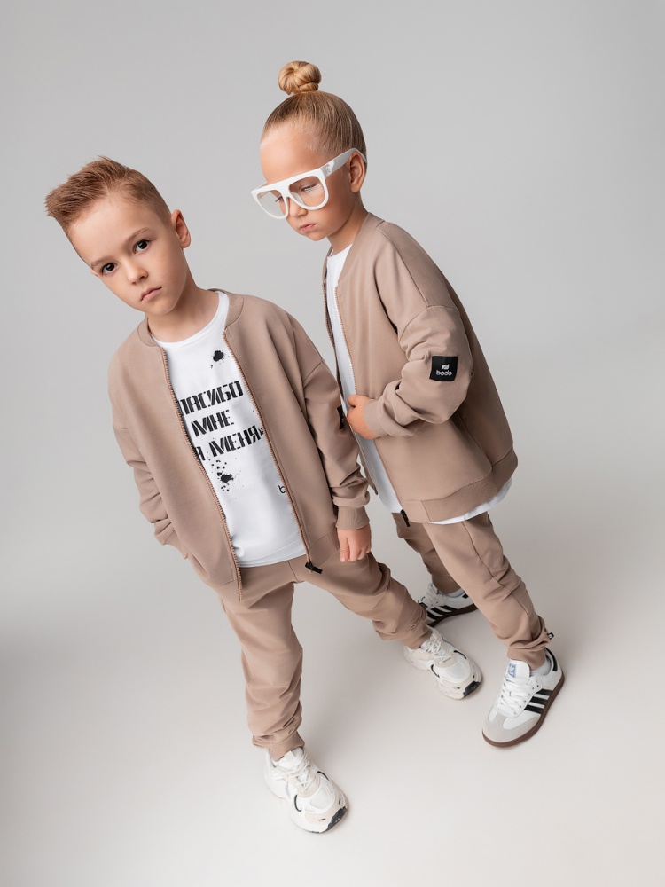 Материал футер двухнитка Состав 92% хлопок 8% лайкра Костюм для детей дошкольного возраста. Бомбер прямого силуэта свободный с центральной бортовой застёжкой на молнию, со спущенным плечом с втачным длинным рукавом с притачной манжетой. Бомбер с поясом по низу изделия. Горловина округлой формы. Брюки прямые свободные на притачном поясе с внутренней резинкой, на притачной манжете по низу изделия.