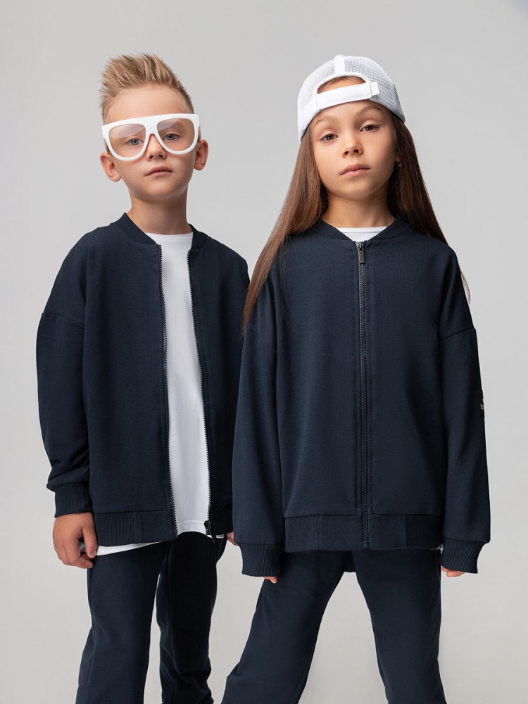 Материал футер двухнитка Состав 92% хлопок 8% лайкра Костюм для детей дошкольного возраста. Бомбер прямого силуэта свободный с центральной бортовой застёжкой на молнию, со спущенным плечом с втачным длинным рукавом с притачной манжетой. Бомбер с поясом по низу изделия. Горловина округлой формы. Брюки прямые свободные на притачном поясе с внутренней резинкой, на притачной манжете по низу изделия.