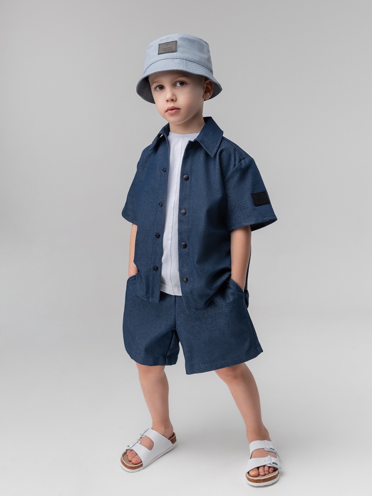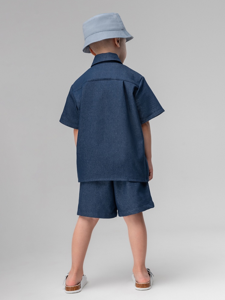 Артикул 11-591MU Состав 80% хлопок 20% полиэстер Материал джинсовая ткань Костюм: рубашка и шорты. Прямая рубашка без подкладки на кнопках, отложной воротничок, короткий рукав. Низ изделия прямой. Шорты прямые свободные на поясе с внутренней резинкой. Шорты с боковыми карманами.