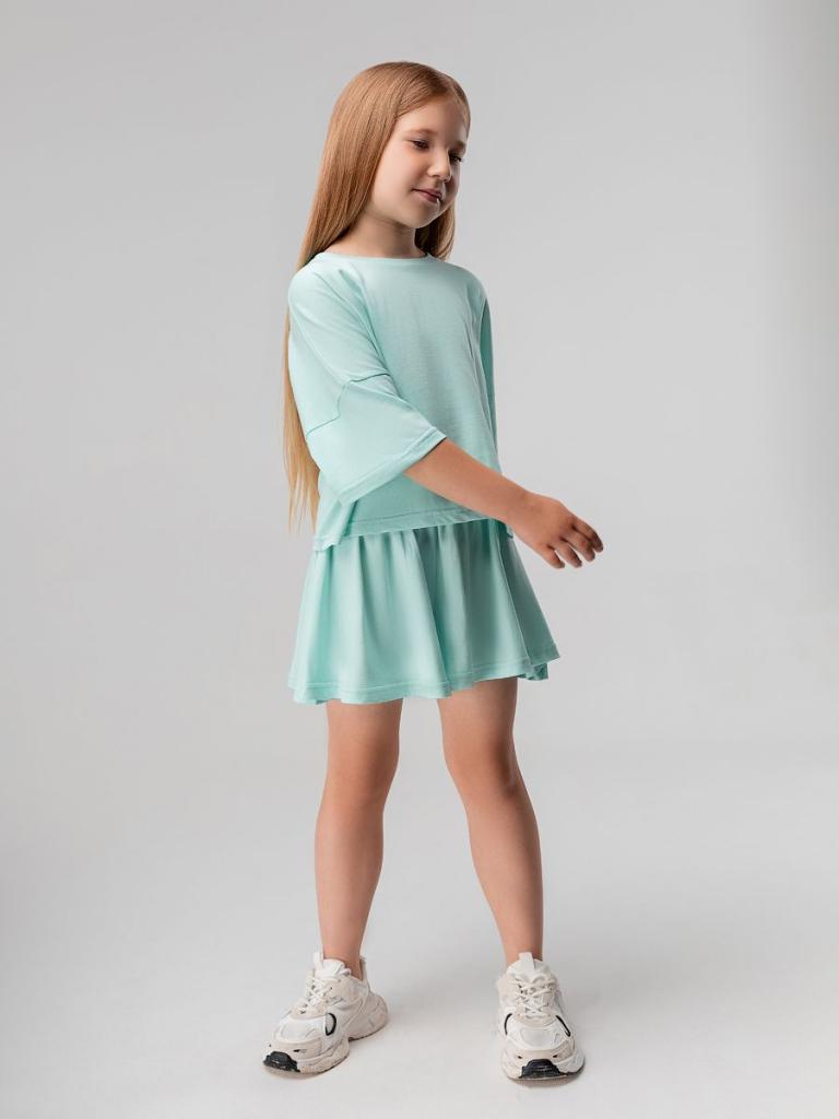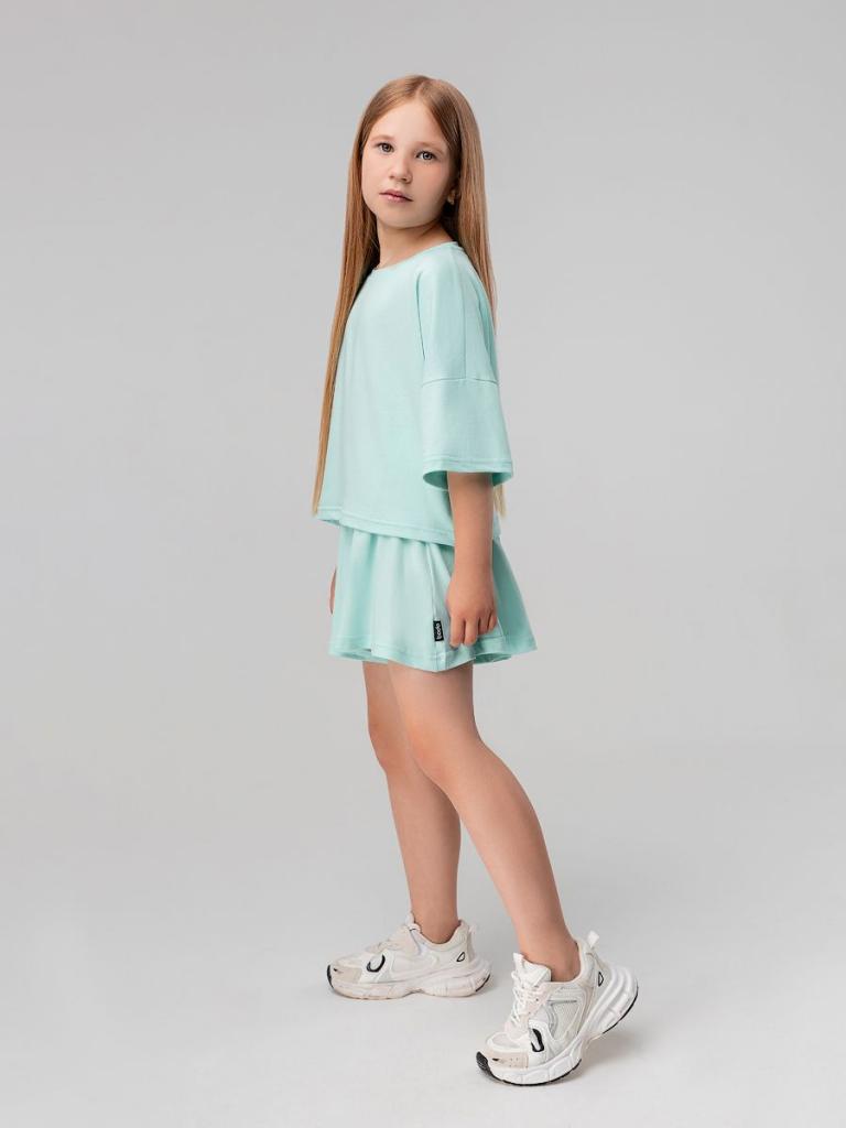 Артикул 11-595MU Состав 92% хлопок 8% лайкра Материал кулирная гладь Костюм для детей дошкольного возраста. Футболка укороченная свободного силуэта со спущенным плечом с втачным коротким рукавом. Горловина футболки округлой формы, обработана рибаной. Шорты-юбка для детей дошкольного возраста. Шорты свободные на притачном поясе с внутренней резинкой, с боковыми карманами.