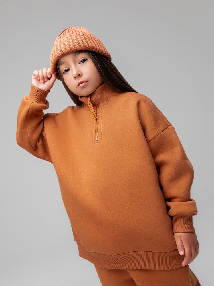 Материал футер трехнитка с начесом Состав 80% хлопок 20% полиэстер Костюм для детей дошкольного возраста. Толстовка свободного силуэта, со спущенным плечом и втачными рукавами с притачной манжетой. Воротник стойка, застёжка на короткую молнию по центру полочки.Брюки прямые свободные на притачном поясе с внутренней резинкой, на притачной манжете по низу изделия. С боковыми карманами.