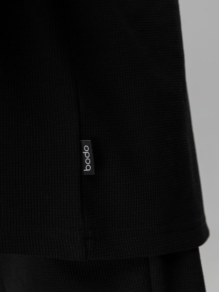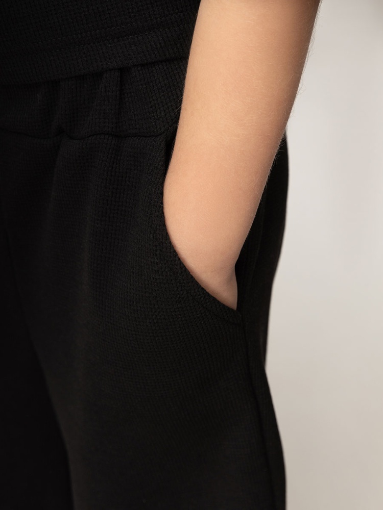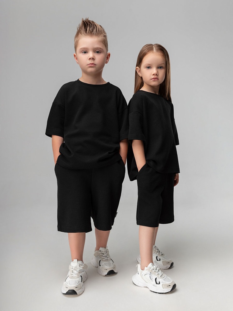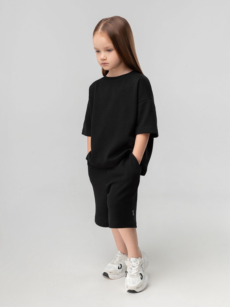 Материал кулирная гладь Состав 92% хлопок 8% лайкра Костюм из вафельной кулирки: футболка и шорты. Футболка свободного силуэта с коротким рукавом. Шорты прямые, свободные с боковыми карманами.