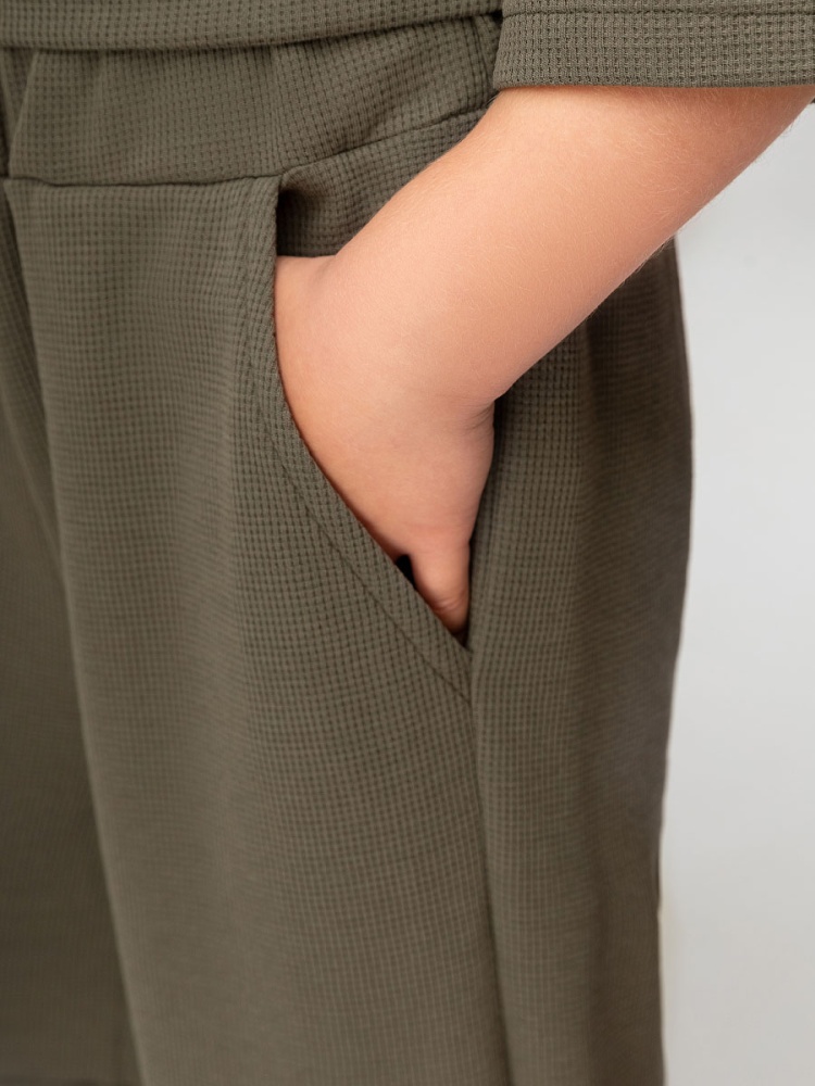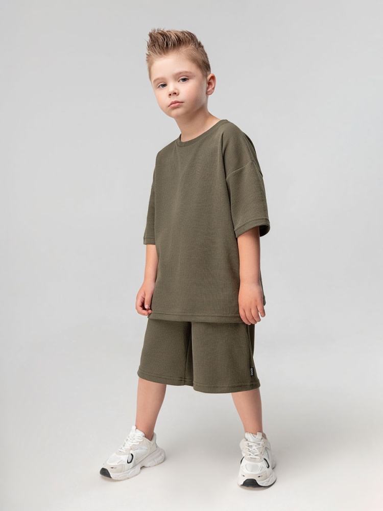 Материал кулирная гладь Состав 92% хлопок 8% лайкра Костюм из вафельной кулирки: футболка и шорты. Футболка свободного силуэта с коротким рукавом. Шорты прямые, свободные с боковыми карманами.