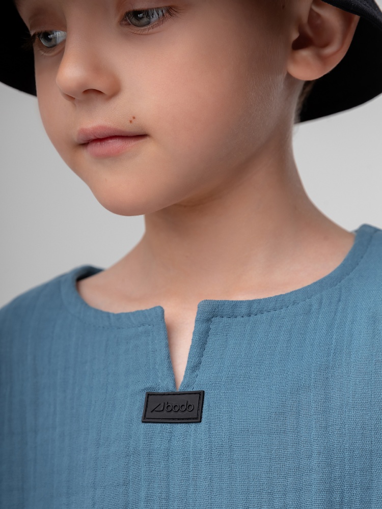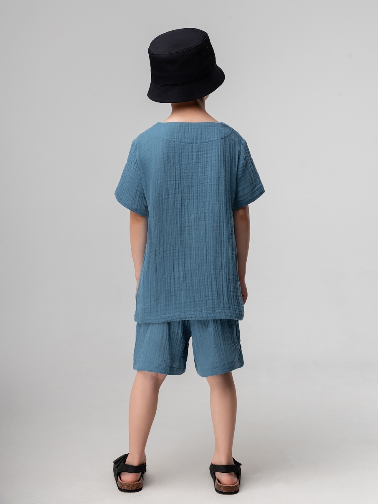 Материал муслин Состав 100% хлопок Легкий муслиновый костюм: футболка и шорты. Прямая футболка с коротким рукавом, ворот с разрезом и свободные шорты с поясом на резинке.