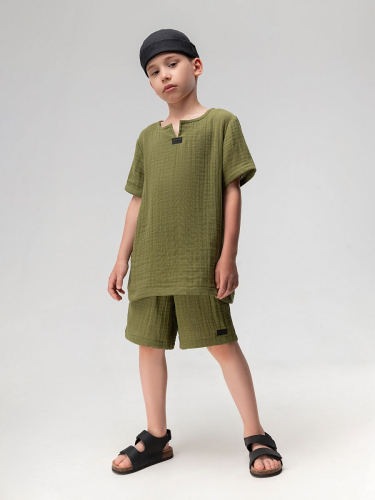 Материал муслин Состав 100% хлопок Легкий муслиновый костюм: футболка и шорты. Прямая футболка с коротким рукавом, ворот с разрезом и свободные шорты с поясом на резинке.