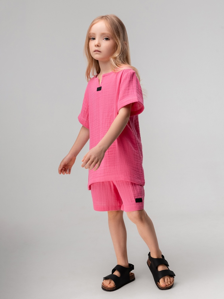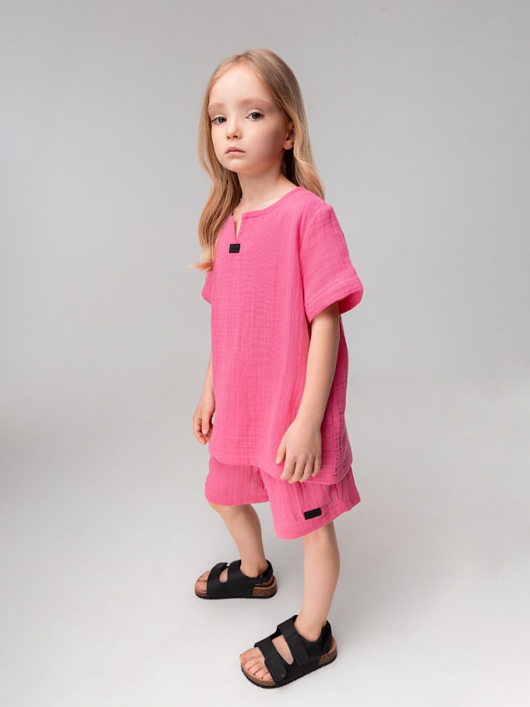 Материал муслин Состав 100% хлопок Легкий муслиновый костюм: футболка и шорты. Прямая футболка с коротким рукавом, ворот с разрезом и свободные шорты с поясом на резинке.