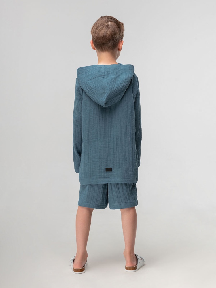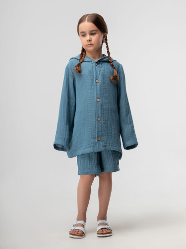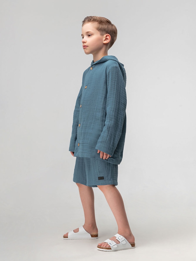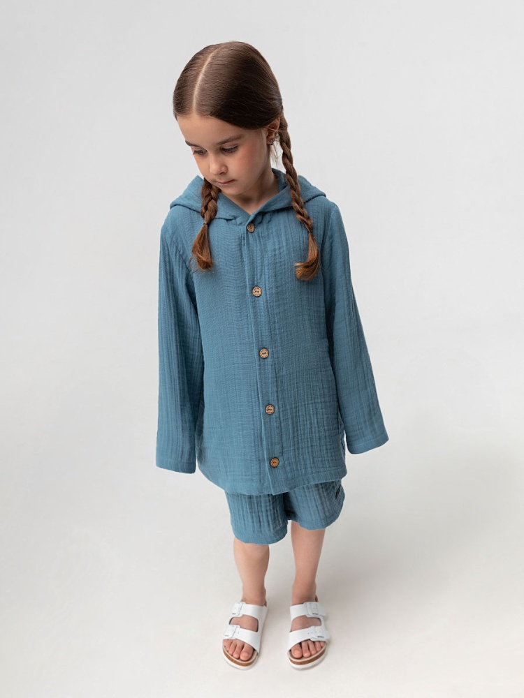 Материал муслин Состав 100% хлопок Муслиновый костюм: рубашка и шорты. Рубашка на пуговицах с длинными рукавами и капюшоном. Свободные шорты, пояс на резинке, без карманов.