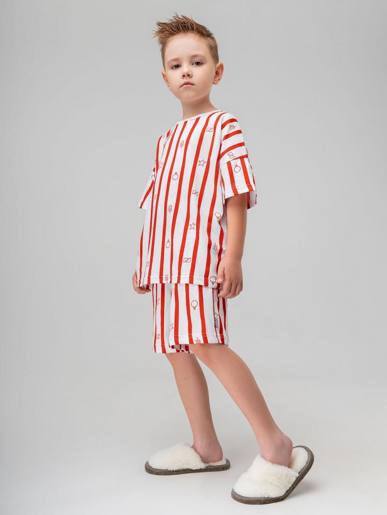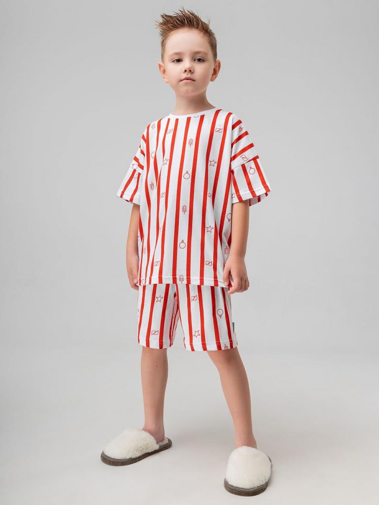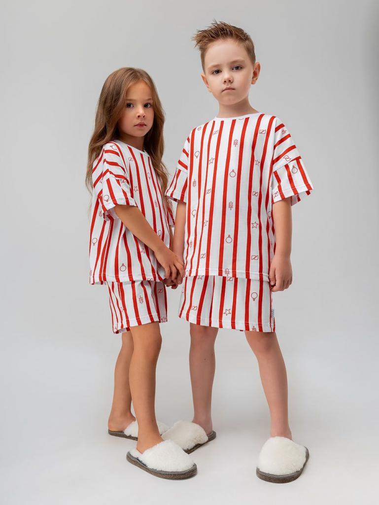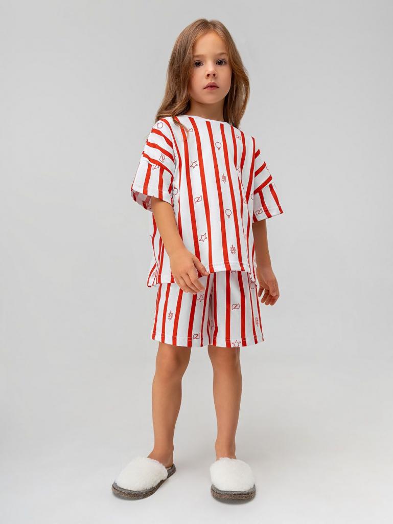 Артикул 11-641MU Материал кулирная гладь Состав 100% хлопок Костюм с набивкой: футболка и шорты. Футболка свободного силуэта с коротким рукавом. Горловина футболки округлой формы. Низ изделия прямой. Шорты свободного силуэта, на поясе, без карманов, низ изделия прямой.