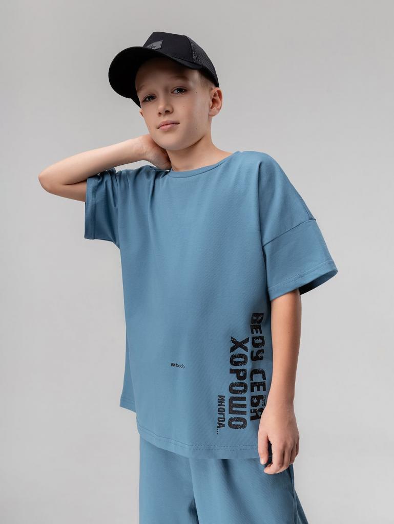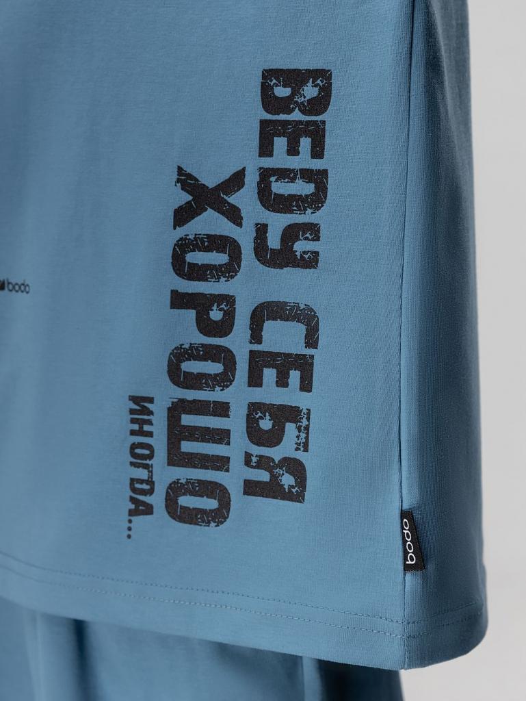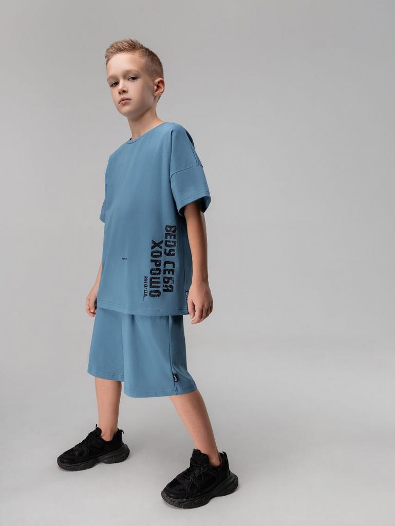 Артикул 11-659MU Состав 92% хлопок 8% лайкра Материал кулирная гладь Костюм: футболка и шорты. Свободная футболка с коротким рукавом. Горловина футболки округлой формы. Низ изделия прямой. принт на полочке "Веду себя хорошо". Шорты прямые, свободные на поясе с внутренней резинкой. Шорты с боковыми карманами отрезной бочок. Низ изделия прямой.