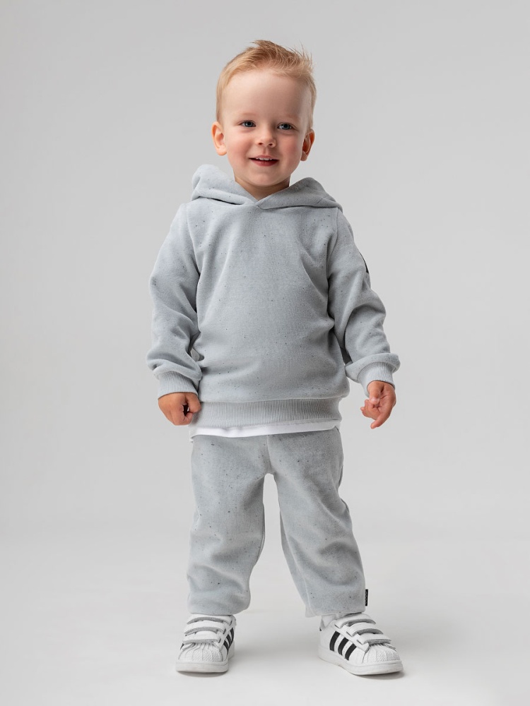 Материал велюр Состав 80% хлопок 20% полиэстер Костюм для детей ясельного возраста. Толстовка без подкладки, прямого силуэта, на притачном поясе по низу изделия, с втачными рукавами с притачной манжетой, капюшон на обтачке. Брюки прямые на притачном поясе с внутренней резинкой. Брюки с манжетой.