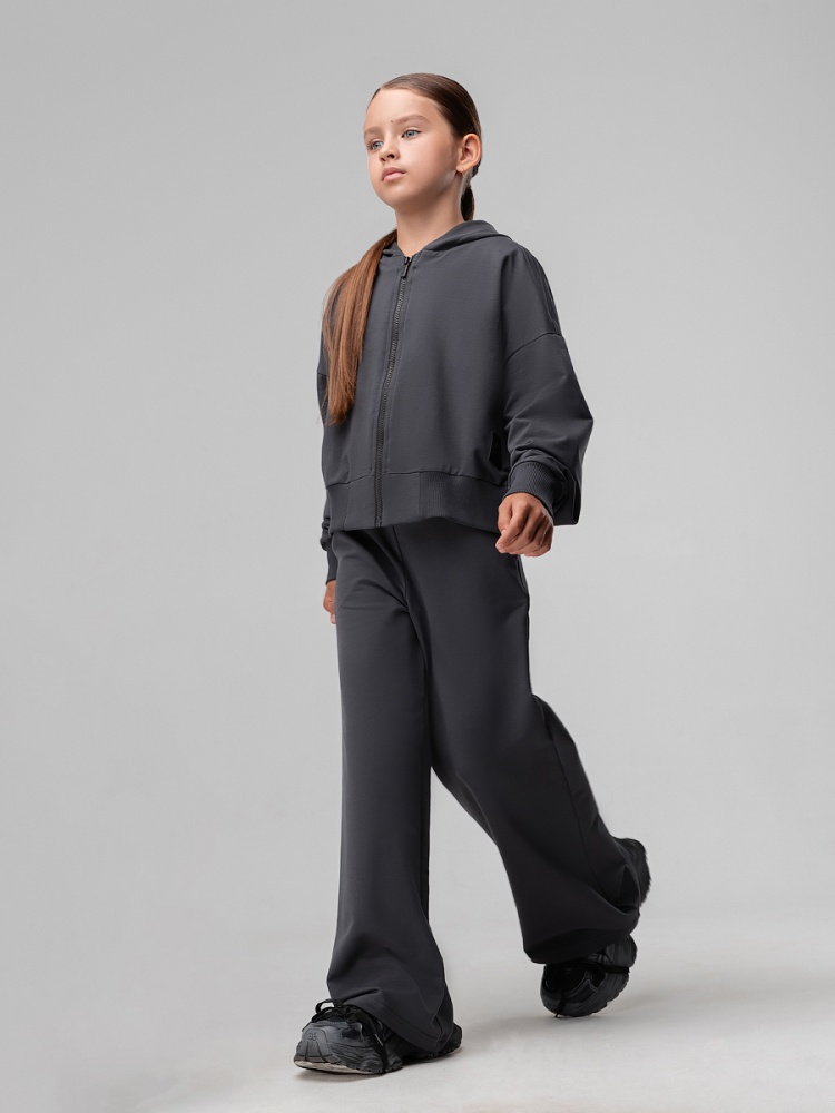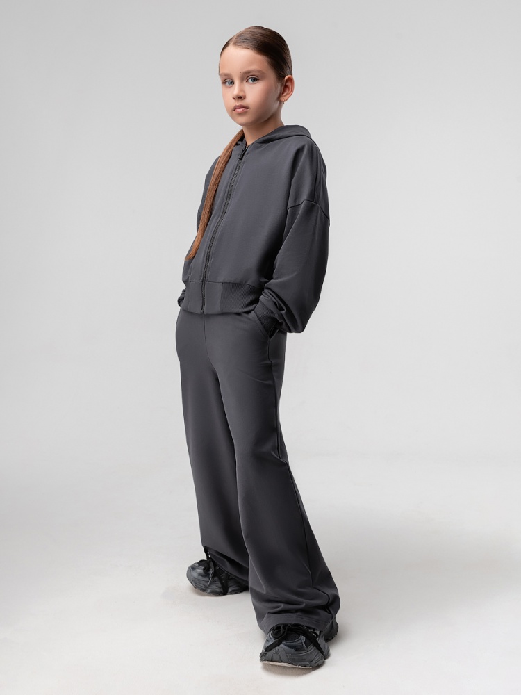 Материал футер двухнитка Состав 92% хлопок 8% лайкра Костюм для детей школьного возраста.Толстовка прямого силуэта, укороченная, с центральной бортовой застёжкой на тесьму молния, на притачном поясе по низу изделия, со спущенным плечом, с втачными рукавами с притачной манжетой, с втачным капюшоном. Брюки свободные, расширенные к низу, на притачном поясе с внутренней резинкой, с боковыми карманами.