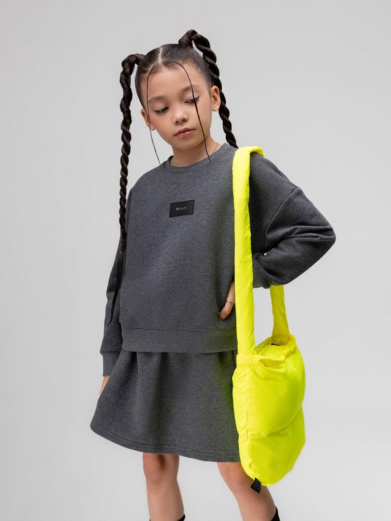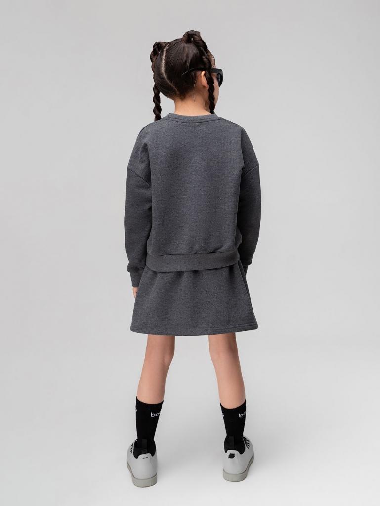 Артикул 11-663MU Состав 80% хлопок 20% полиэстер Материал футер двухнитка Костюм из ткани пике: свитшот и юбка. Укороченная толстовка прямого силуэта со спущенным плечом. На полочке расположена нашивка. Толстовка с поясом по низу изделия. Юбка свободная, расширенная к низу. Пояс на шнурке-резинке со стопором.