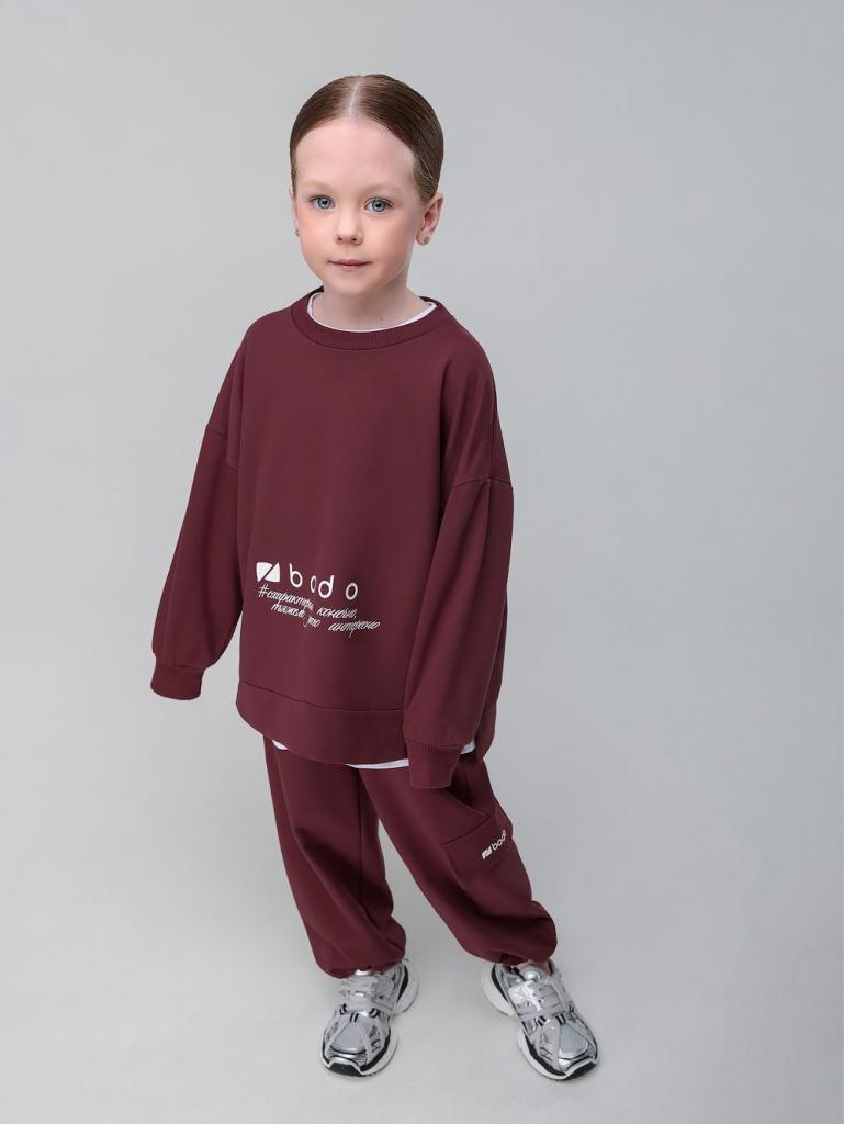 Артикул 11-668MU Состав 92% хлопок 8% лайкра Материал футер двухнитка Костюм: свитшот и брюки. Прямая, свободная толстовка с разрезами по бокам. Длинные рукава на манжете. Длина изделия полочки короче длины изделия спинки. Округлая горловина. На полочке принт "бодо с характером". Свободные, прямые брюки на поясе с внутренней резинкой. Брюки с накладными карманами с клапанами по боковым швам, по низу брюк имеется дополнительная резинка с фиксатором для затяжки.