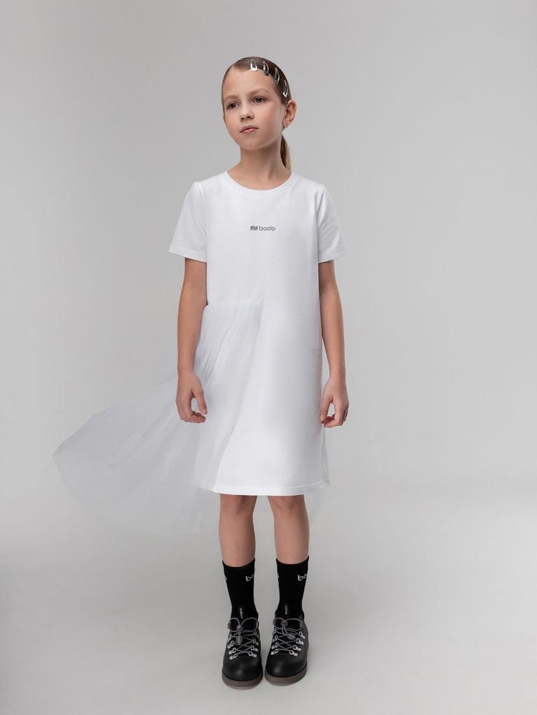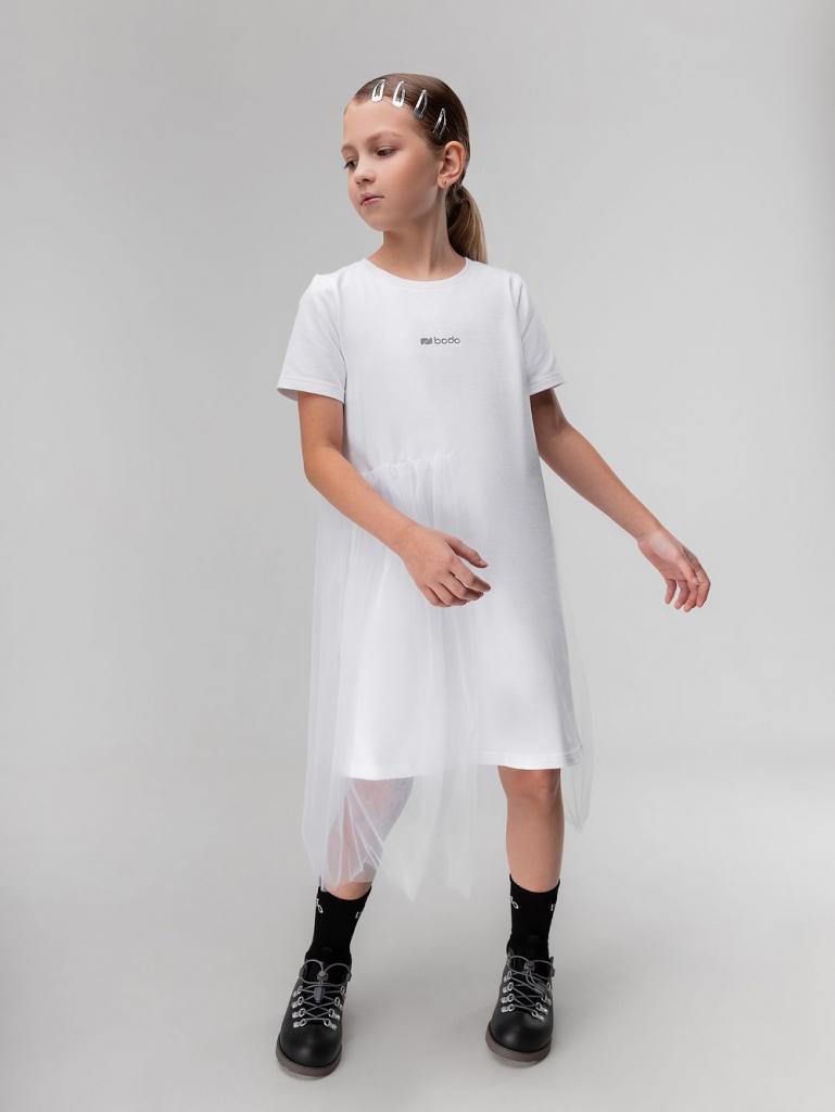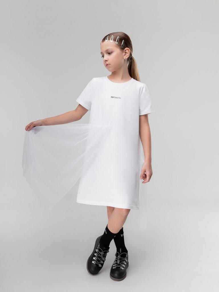 Артикул 18-192MD Состав 92% хлопок 8% лайкра Материал футер двухнитка Платье свободного силуэта, с фатином, с коротким рукавом. Горловина округлой формы.