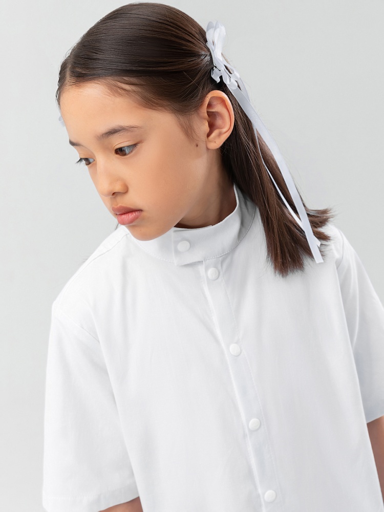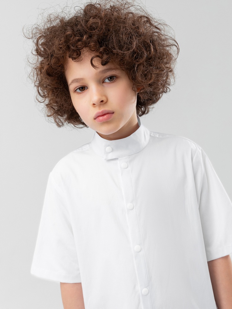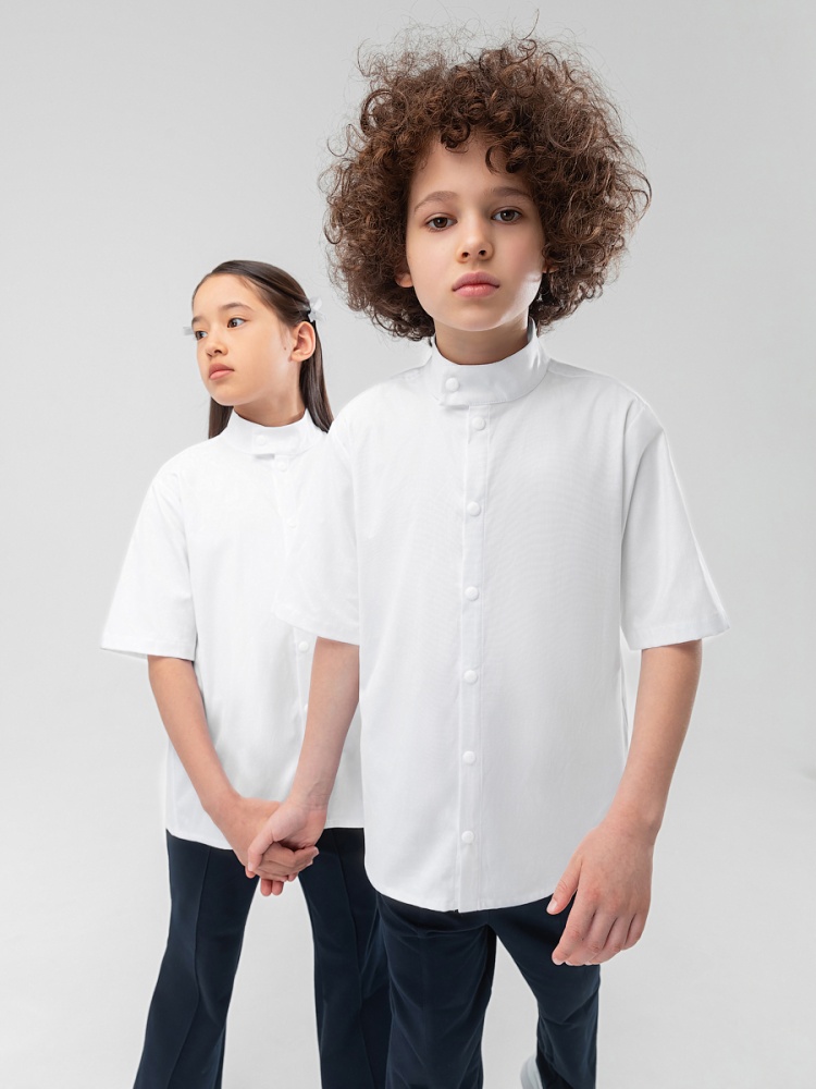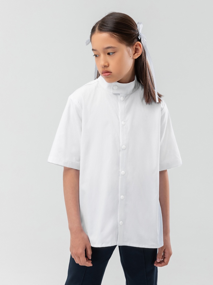 Материал рубашечная ткань Состав 55% хлопок 45% полиэстер Рубашка прямого кроя на кнопках с коротким рукавом. Воротник стойкой на кнопках.