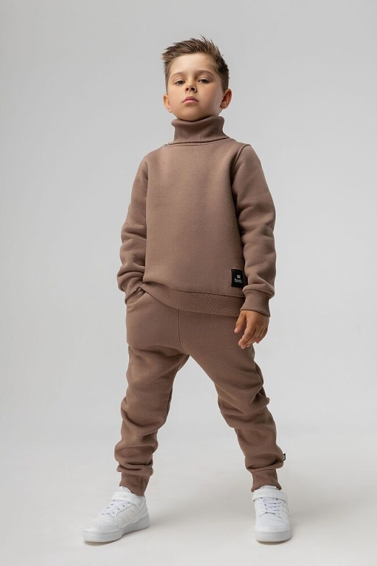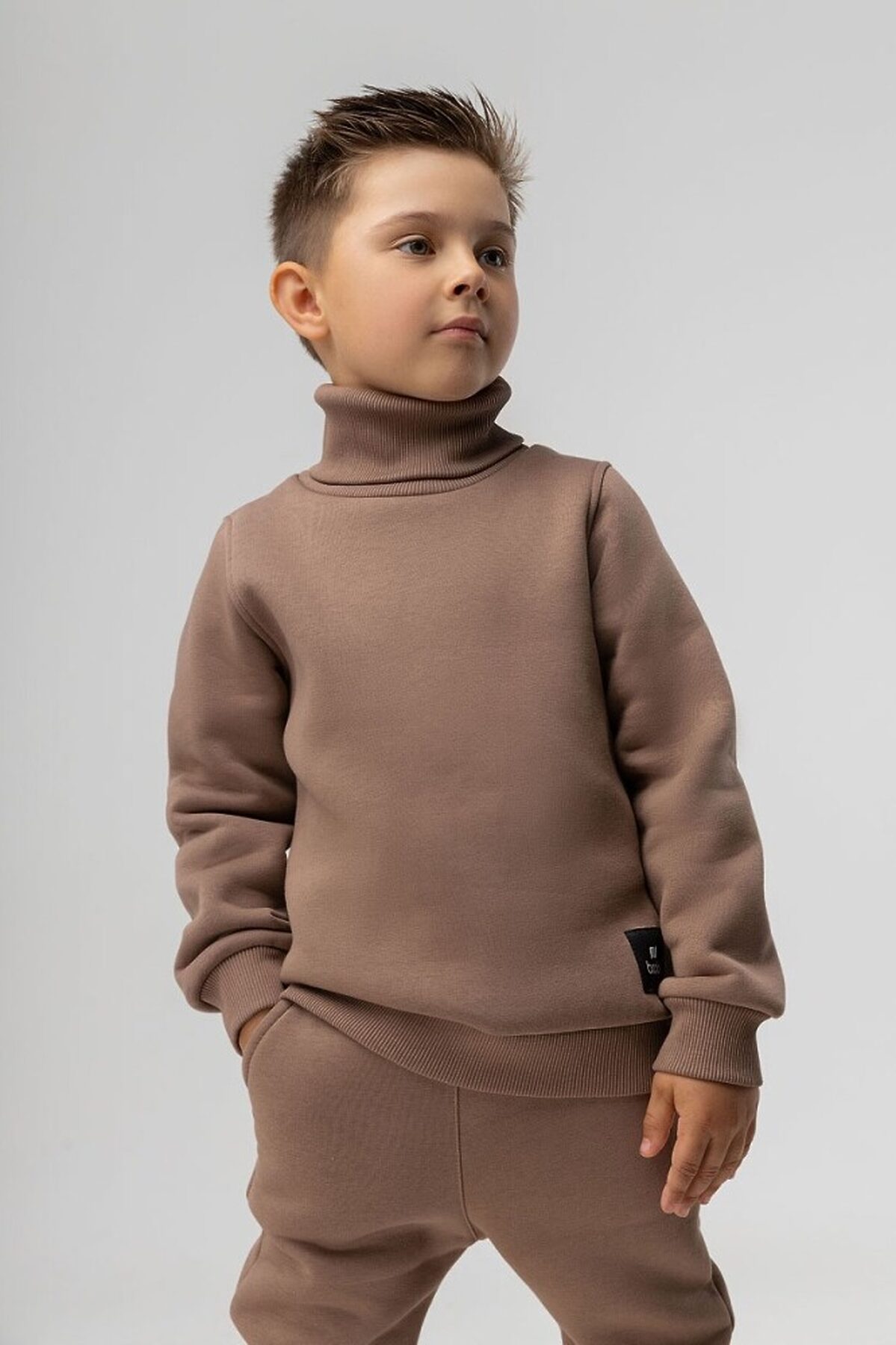 Материал футер трехнитка с начесом Состав 80% хлопок 20% полиэстер Детский костюм. Толстовка с воротником-стойка, рукава на манжетах, полуприлегающий покрой. Брюки- джоггеры, детали: пояс - эластичная резинка, низ изделия- манжеты. Состав: футер трехнитка с начесом 80% хлопок 20% полиэстер